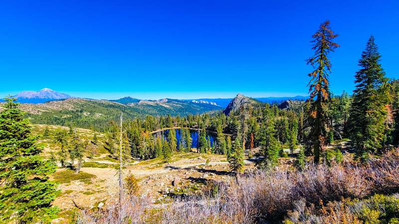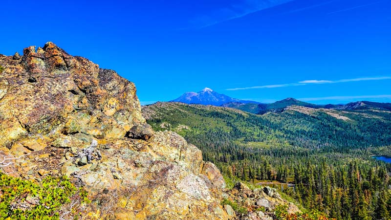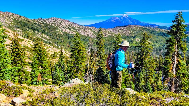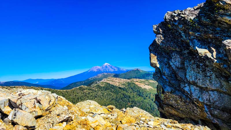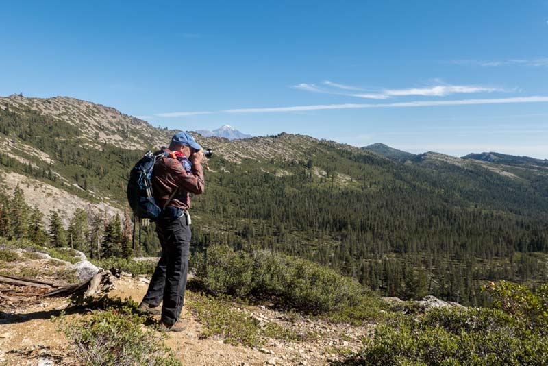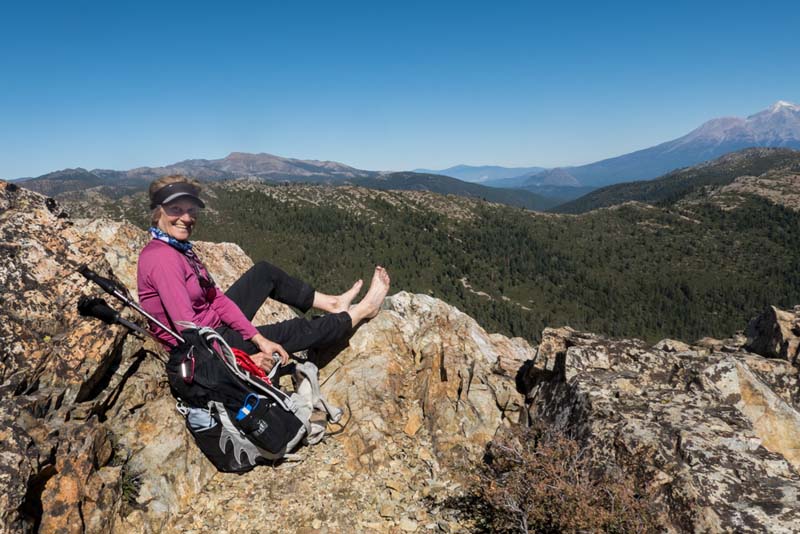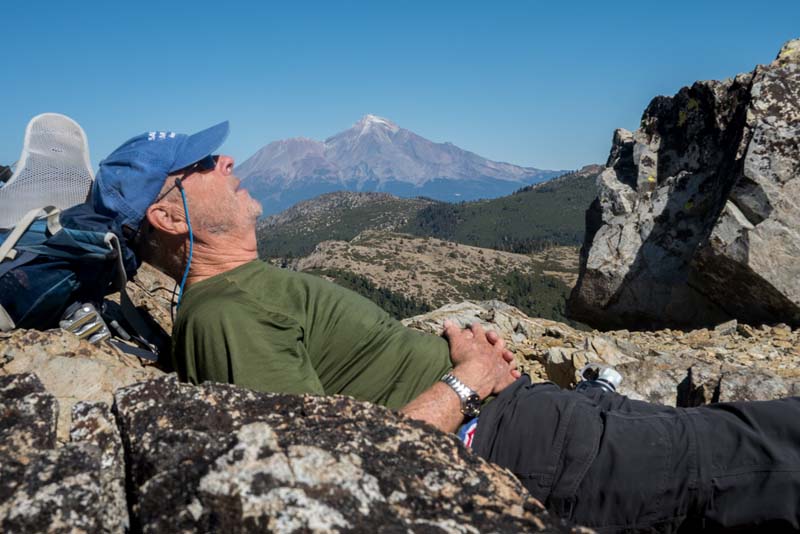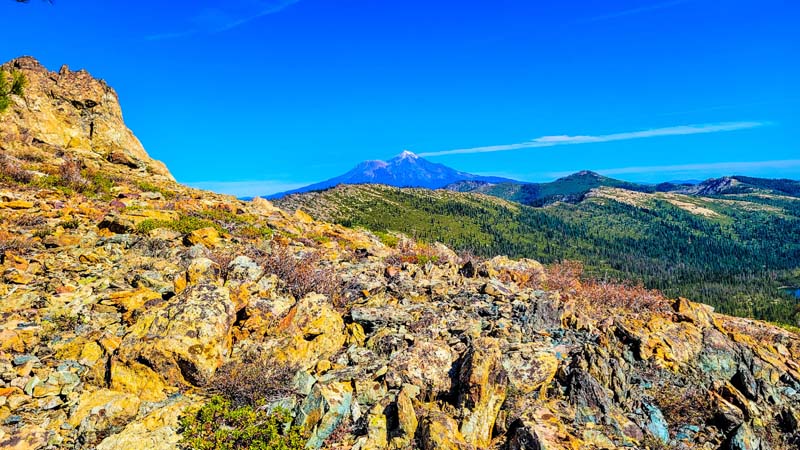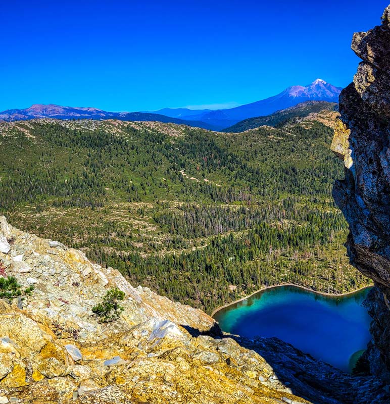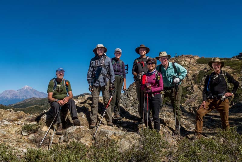 Seven of us headed south to Gumboot Saddle for a hike up to Boulder Peak. This is easily in my top 5 hikes within the Wednesday Hike Portfolio. The views start within a quarter mile of the start and don’t stop until you’re almost back to the cars. Shasta is up close a personal. The Crags arrive along with Mt. Lassen in the distance, plus many lakes are visible from the ridges. Yes, it is also one of the tougher hikes, with some serious uphill bushwhacking over big boulders, along with many manzanita bushes in the way, but the effort is worth the views.