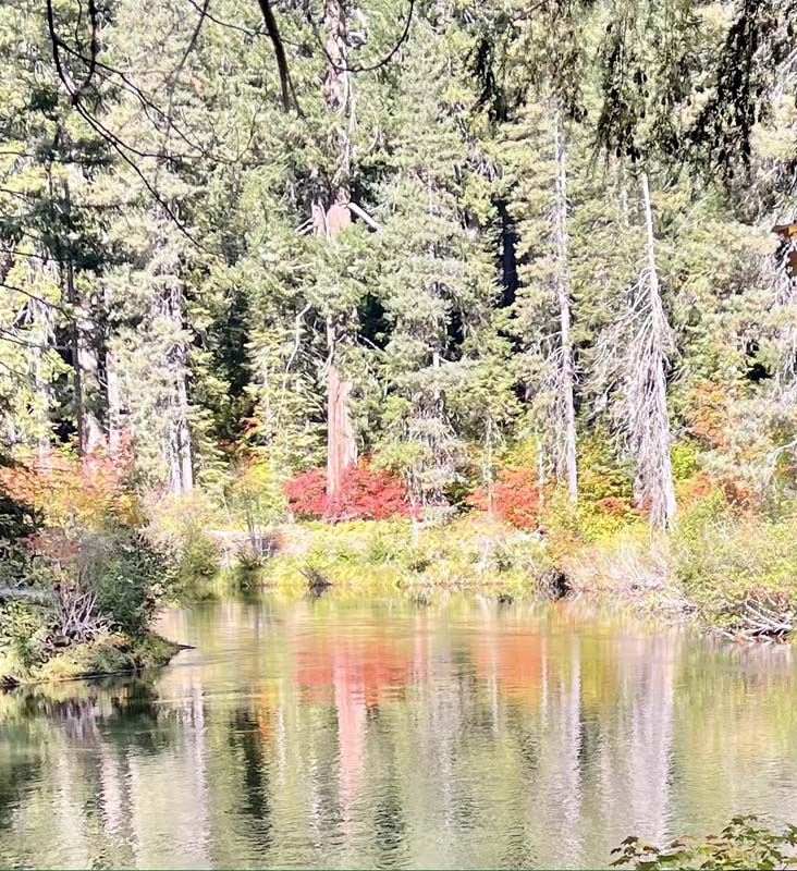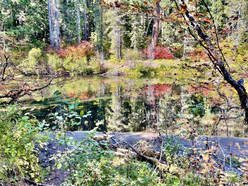 It was a perfect day for fall colors, blazing reds and yellows. Passing through these trees and shrubs is magical. Viewing their vivid display on the distant shore, mirrored in the river, is one of the most magnificent features of fall in southern Oregon. We wondered about the species of Maple with such small red and orange leaves, so prolific along the Rogue. My novice ‘research’ led me to believe the variety is the Vine Maple, which some fellow hikers suggested uncertainly. It’s a native deciduous shrub that grows to 20-25’ tall and 15-20’ wide. It produces red and white flowers in spring and shows red, orange and yellow in the fall. It prefers shady areas. (If Liz or anyone knows otherwise, please let us know). I learned also that there are over 100 species and nearly as many subspecies of Maple, just 13 are native in North America.