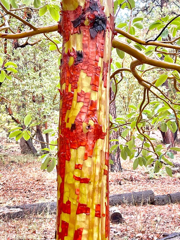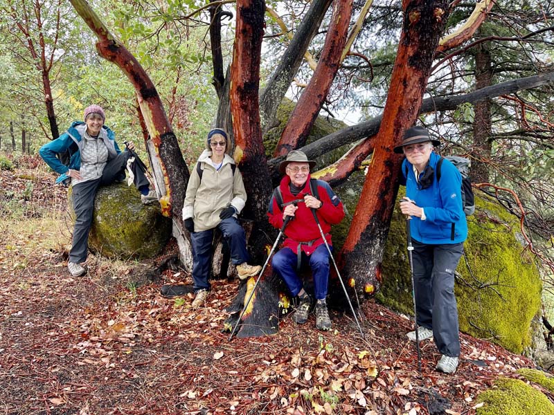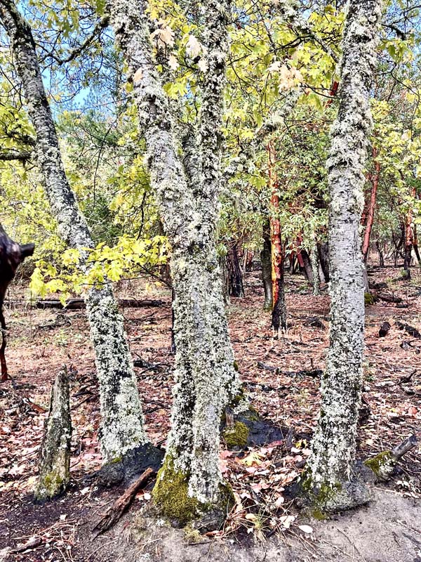 Trees and shrubs glistened from the recent rain with the red Madrone bark peeling off in stripes and squares. Lichen appeared to spring from tree trunks. Maples with golden leaves were striking along Clay Creek among the pines and fir.