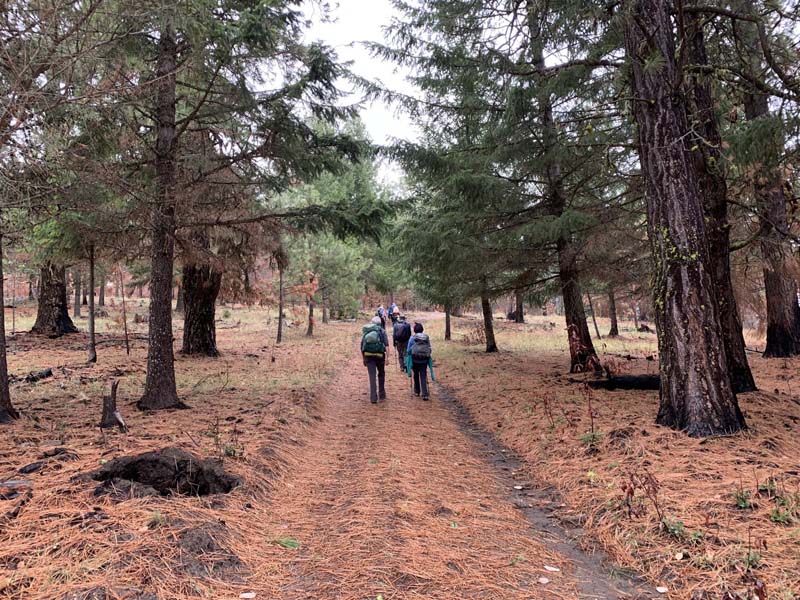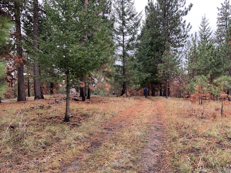 The first hour and a half was dry and included several stops to shed layers and wipe sweat as we climbed to meet the clouds. By lunch (12 sharp) we added extra layers to retain heat while we ate. Thirty minutes later, we bundled up with more layers and started down. The rain held off until the last half mile on the Ditch Road Trail. Weather turned out not to be an issue.