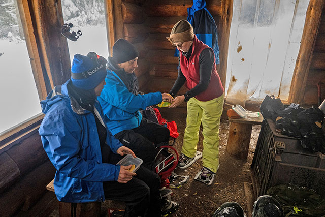 We encountered between 6 and 18 inches of snow along the trail. On the way to the shelter for lunch, it was calm and lightly snowing. The shelter has been cleaned from head to toe and stocked with lots of firewood. It was the cleanest I have ever seen it. Lunch was wonderful, being fully protected from the outside elements.