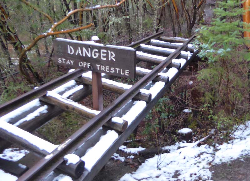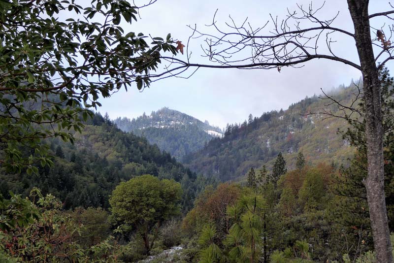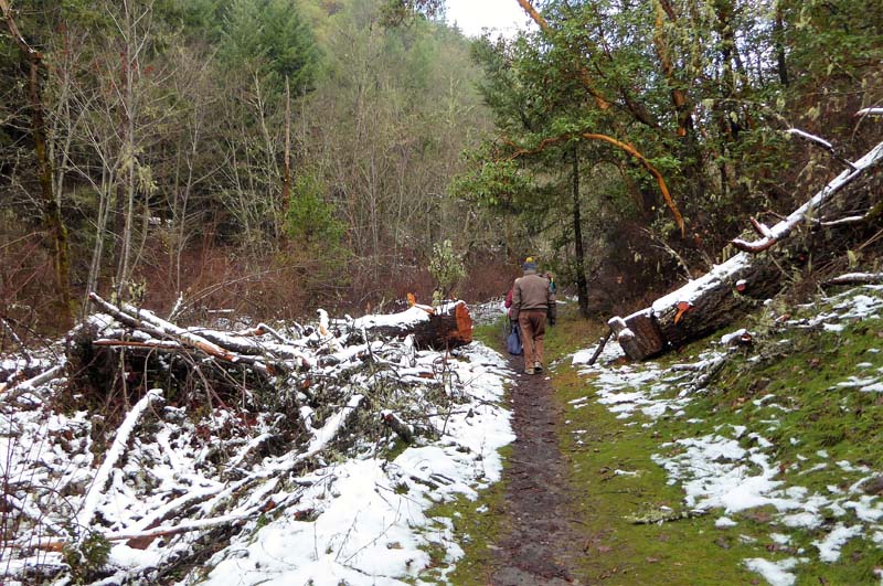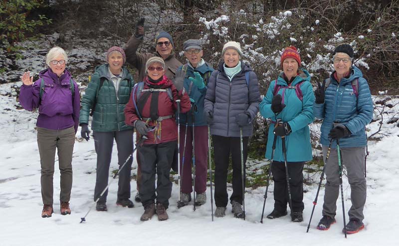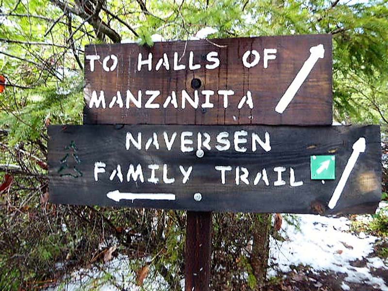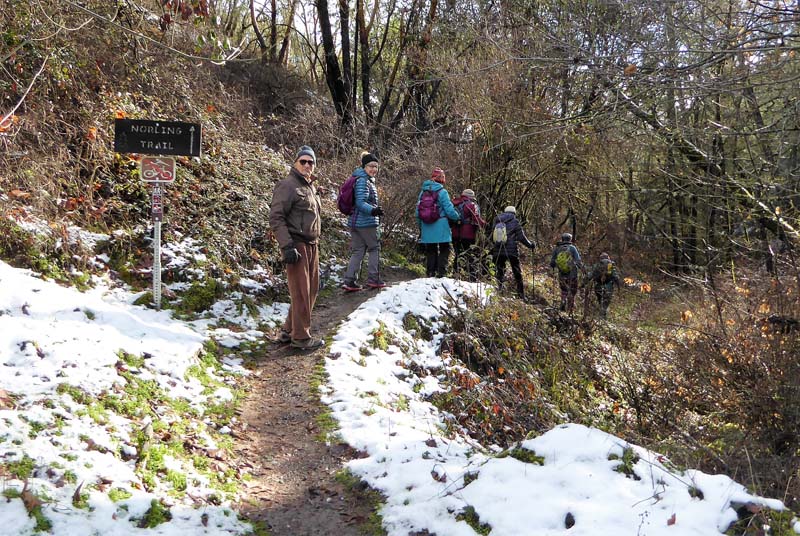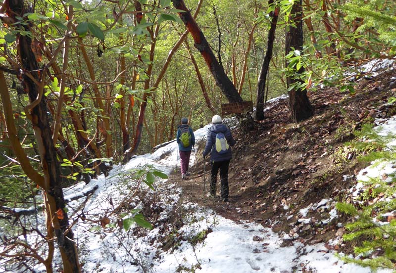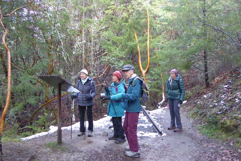Our collection of eight hikers returned to P1 to park and then enjoyed a 4½-mile hike on the Rail, Norling, ol’ Miners’, Boulder, and Ridgeview Trails, making three loops. The upper Ridgeview section had more snow and climbed through absolutely beautiful evergreens, madrone, and manzanita; and it gave us a magnificent view westward from the highest point that opened up at the site of a viewing bench.