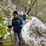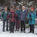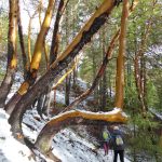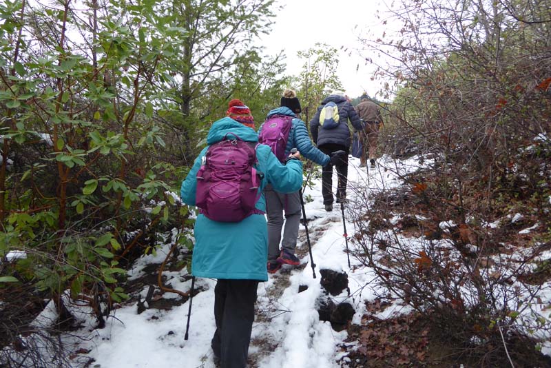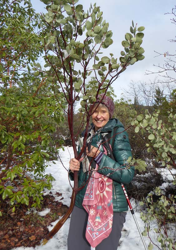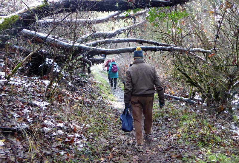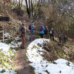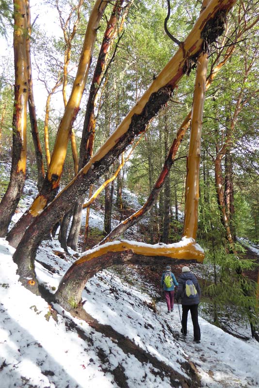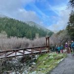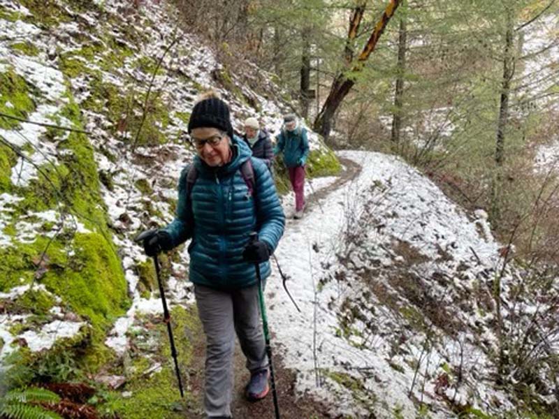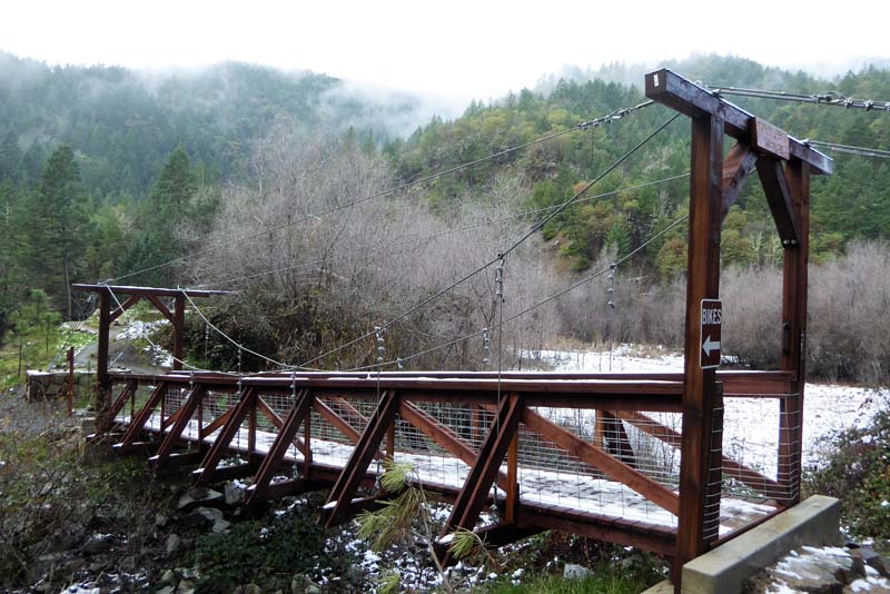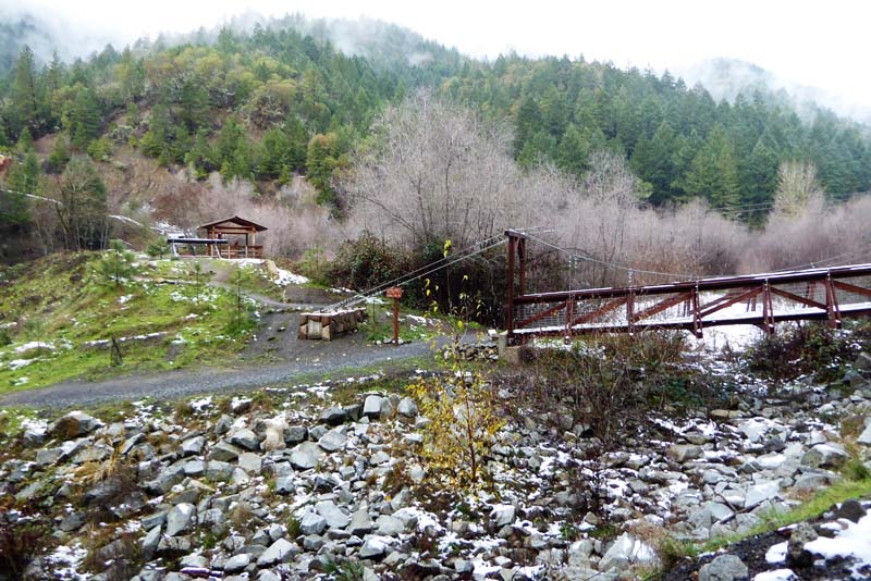 Our collection of eight hikers returned to P1 to park and then enjoyed a 4½-mile hike on the Rail, Norling, ol’ Miners’, Boulder, and Ridgeview Trails, making three loops. The upper Ridgeview section had more snow and climbed through absolutely beautiful evergreens, madrone, and manzanita; and it gave us a magnificent view westward from the highest point that opened up at the site of a viewing bench.