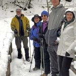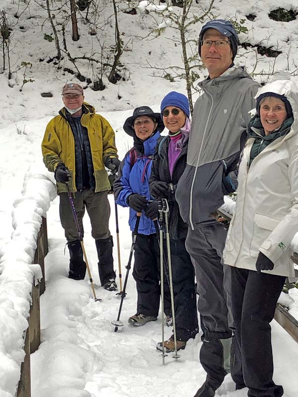 The funniest episode occurred when Mike W. came out of the woods and back down the trail to the lunching group, wondering why he was lopsidedly sinking on one side. Laughing, his fellow snowshoers pointed out that he was missing one snowshoe, whereupon he had to backtrack into the woods to retrieve it. Seems when one is that tall, he has trouble seeing his feet.