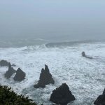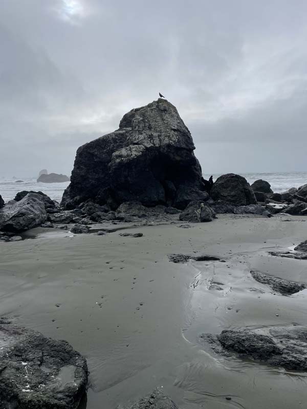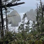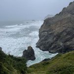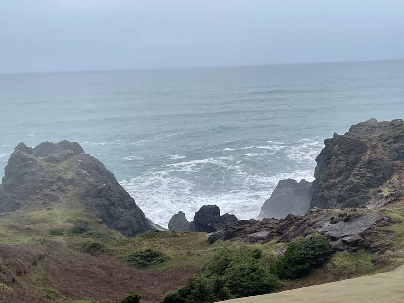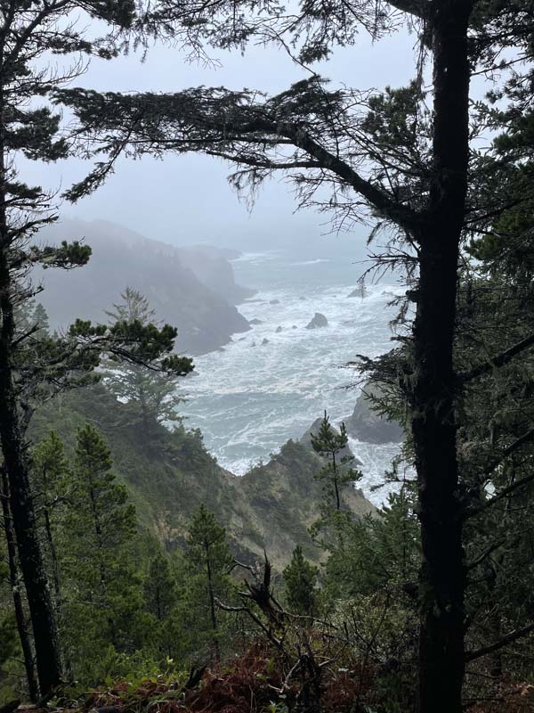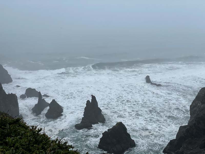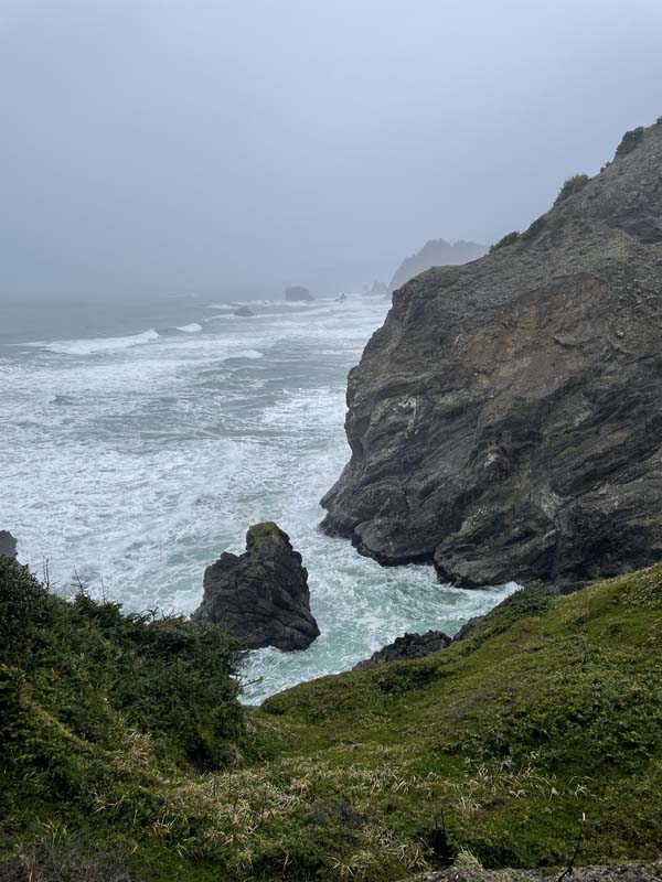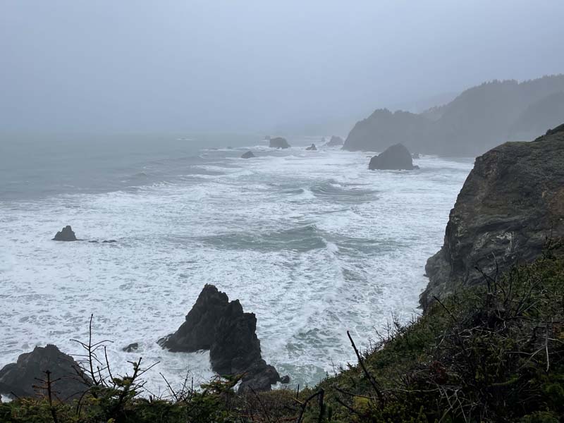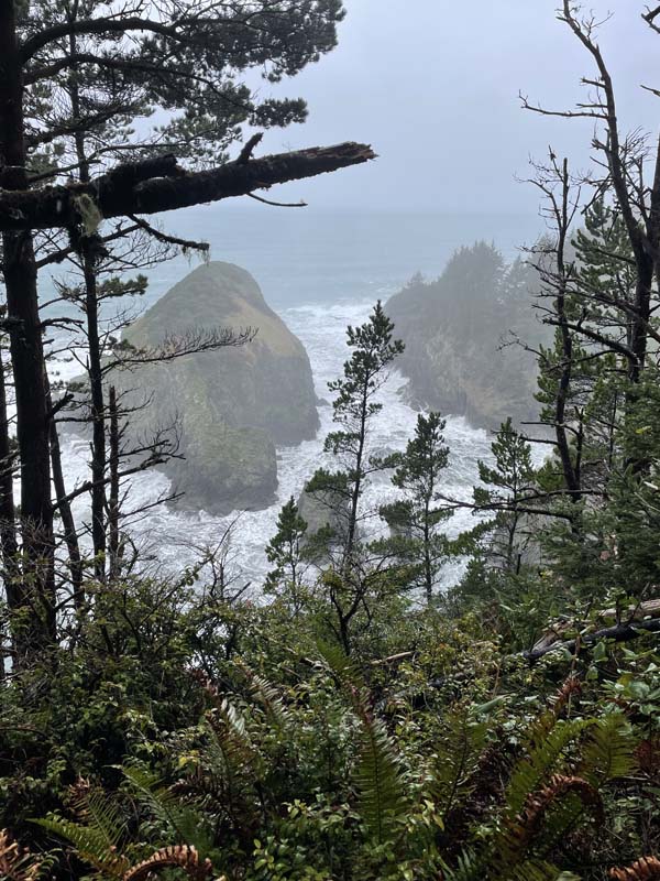 The views along the way were magnificent, with huge waves crashing in the mist.The views at Indian Sands and just after were simply sensational. We found a sort of natural tunnel and had lunch, protected from the rain. There was quite a bit of ascent throughout the hike and a bit of a steep climb to gain the highway at the turnoff for Indian Sands. At this point we decided to do a mile down the road rather than 3 miles back along the trail, where we would have been thoroughly drenched.