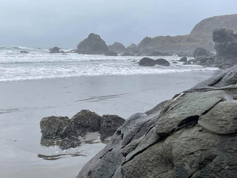 We left early on Thursday to get to the coast in time for a good hike that day. Rich had sent me Randy’s comments on the condition of the hike to the Klamath River so we headed north and hiked from Whale beach to Indian Sands. The trail was in good condition but it started to rain, lightly for the most part but picking up later.