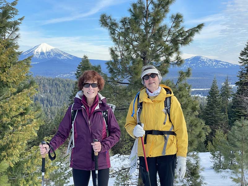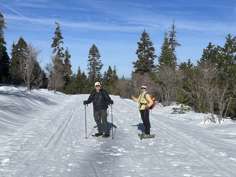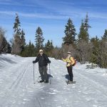 We had a diminished crew for various reasons that led to cancellations, but we three bashed on and did 5 1/2-6 miles in mostly sunshine. The snow started out hard then softened a bit. At the endpoint we relaxed in the sun. For the most part we had the trail to ourselves and then along came some cross-country skiers.