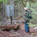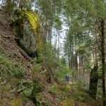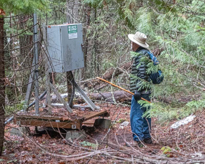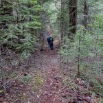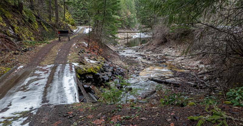 The creek flows over the road with 3-6 inches of cold water. So the resourceful Jerry pulled out a box of white garbage bags which we used to cover our boots while crossing the creek. After crossing the water with varying degrees of success we managed to find the old overgrown road heading up the west side of the Ashland Creek West Fork.