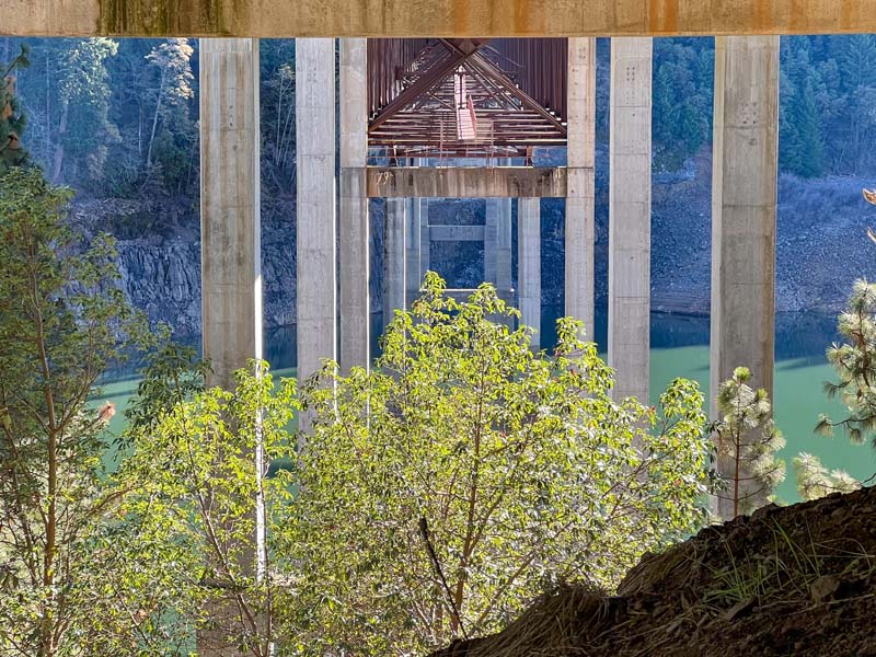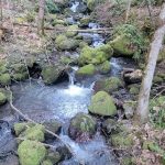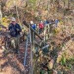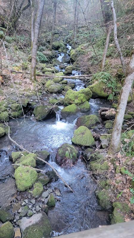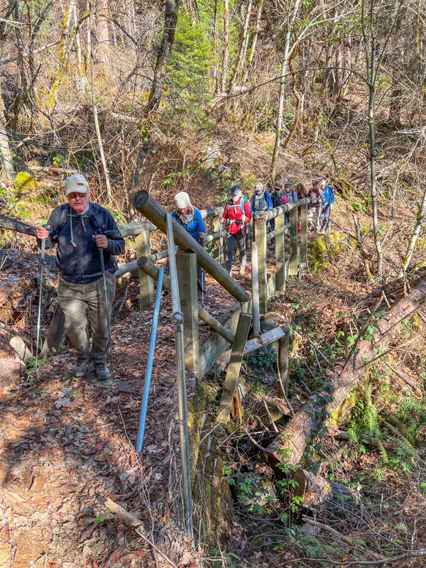 John K had brought pruning shears to cut back a bunch of the blackberry vines that were trying their best to make sure we did not proceed, so that was a big help on the return trip. Most of the bridges were in good shape but one had been hit hard by a tree. It was still strong so no problem to cross the creek. We did see several waterfalls which were great to see and hear.