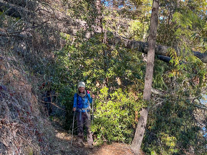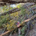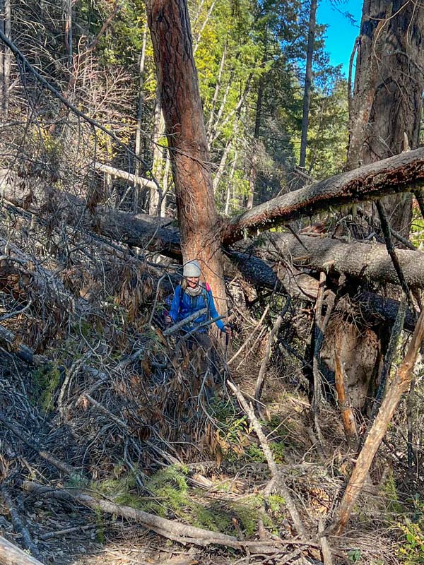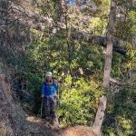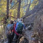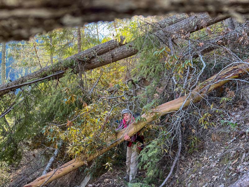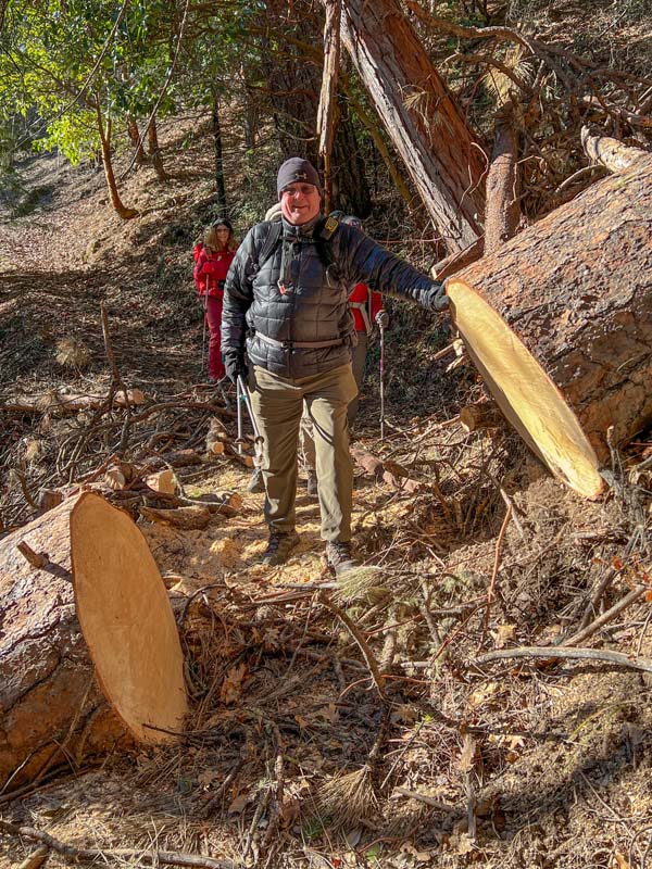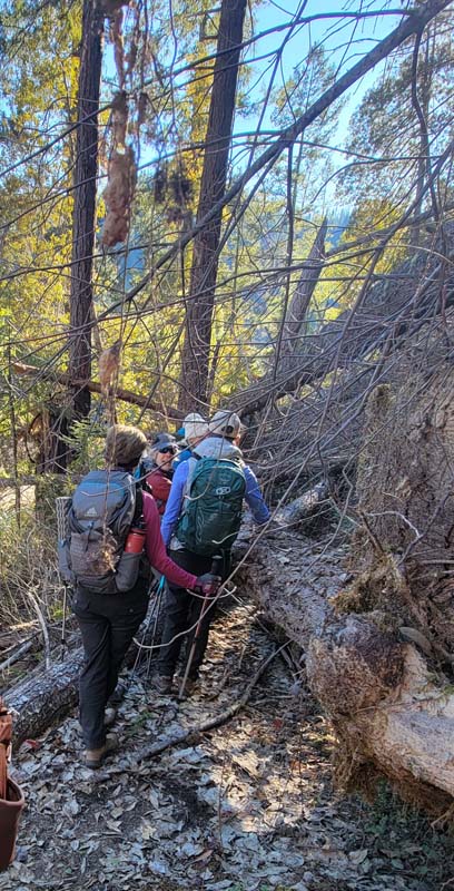 A large tree had been recently cut so things were looking good for the first 2 miles. We hit the normal “turn around here” sign of arrows, but it being Wednesday, we continued. Soon we did hit some downfall and at several points we needed to get down on all fours to get through. However, it was much easier than last year so most of us were pleased.