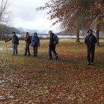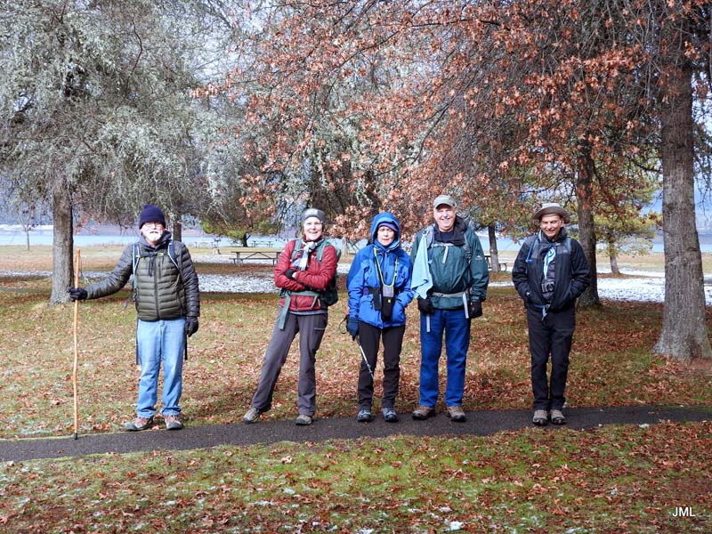 The open parking area featured a heated restroom and a gap in the clouds allowing the sun to warm our start. Temps this day would be in the 30s with a dusting to an inch of snow during our morning by the lake.