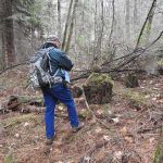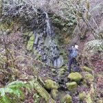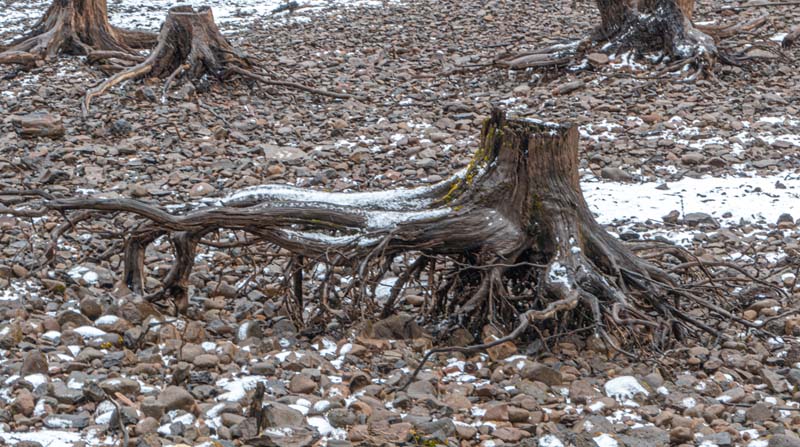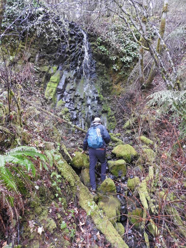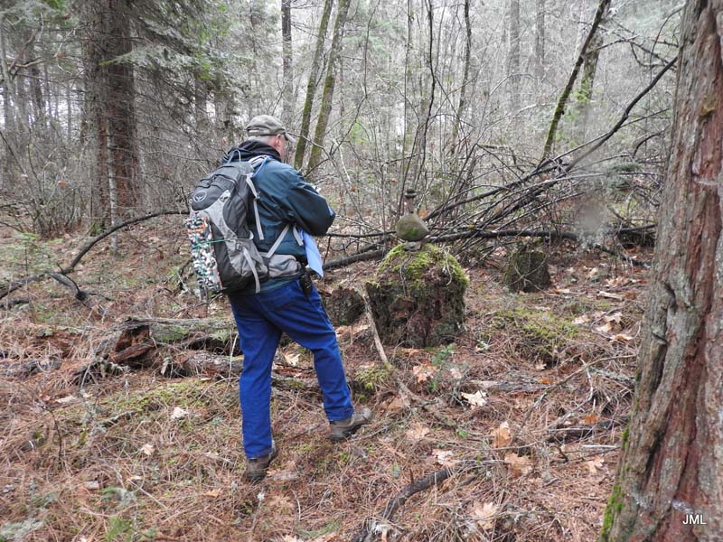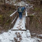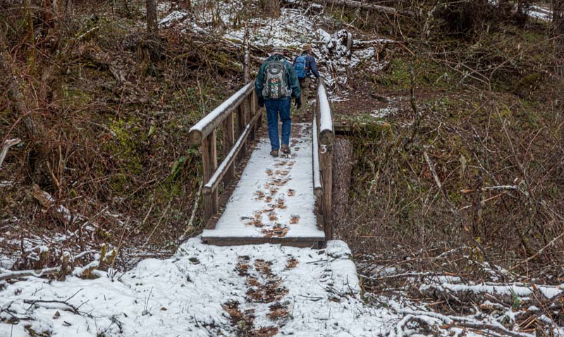 As we got up on the dam’s walkway the snow began to increase with big flakes and a cross wind blowing it sideways. So we huddled and decided to turn around and look for some shelter back in the forest for lunch. We stopped back at the Rumley Falls bridge for lunch.