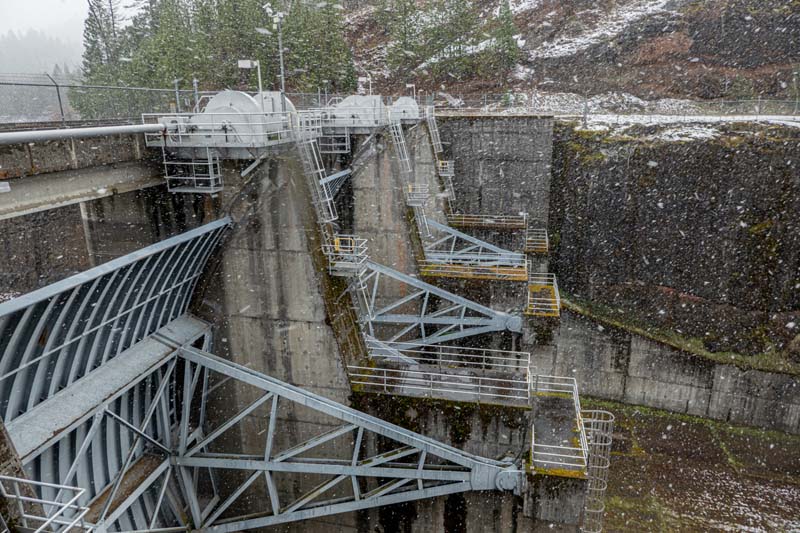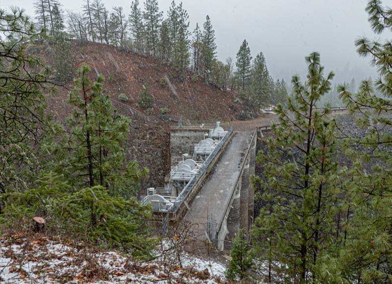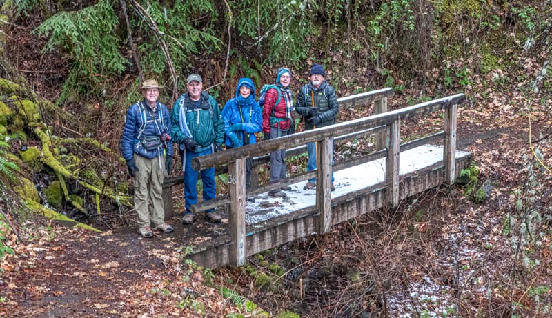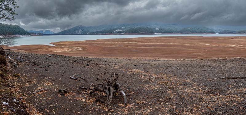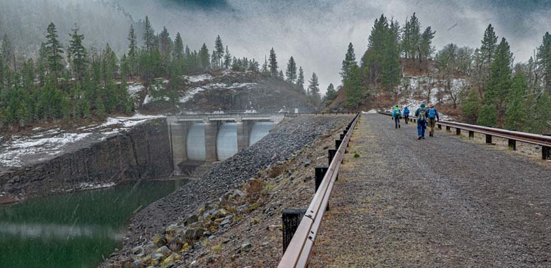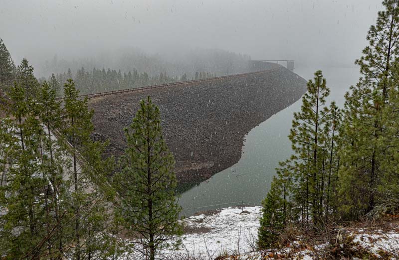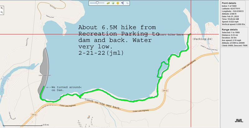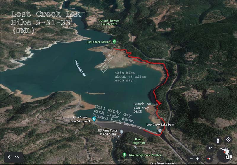 Monday promised to be a wild and crazy day with late season snow predicted in the area. We collected our adventurers in Ashland and drove up Highway 62 to meet the boys near Viewpoint Mike’s TH. No view today with low thunder clouds threatening snow. So we switched to Plan B and headed up to Joseph Stewart Park for a new hike from 2021. We’d start at Lost Creek Lake Marina parking (not the Boat Launch) and hike the 3.5 mile forest trail down to the dam.