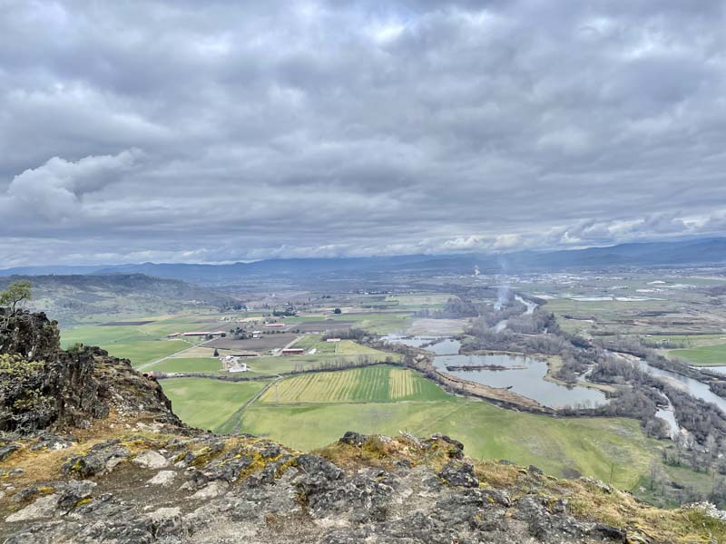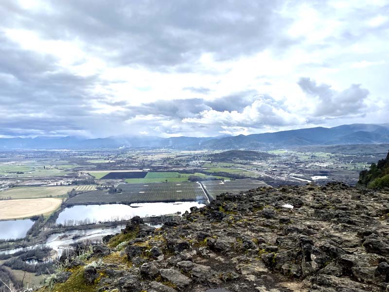 Kay led our group of eleven up the steep winding trail to the top of Lower Table Rock and across the mesa to the opposite side overlooking the bright green fields and meandering Rogue River. A chilly, overcast day, but lovely views and the delightful and artistic shapes created by the madrones.