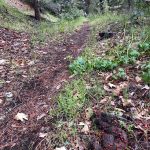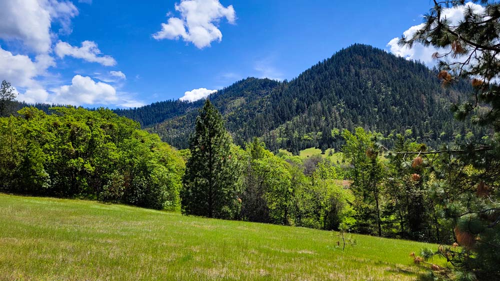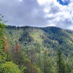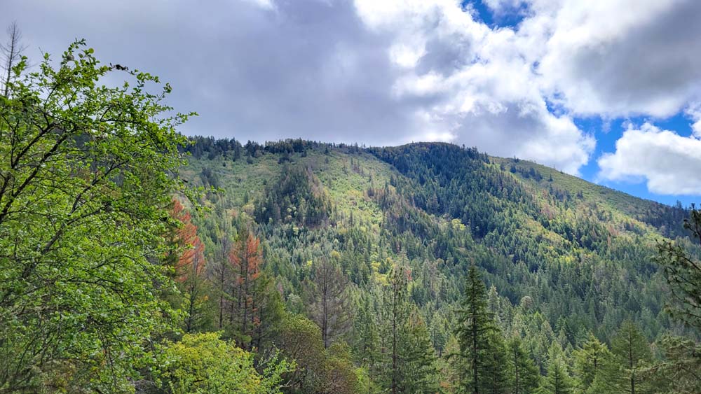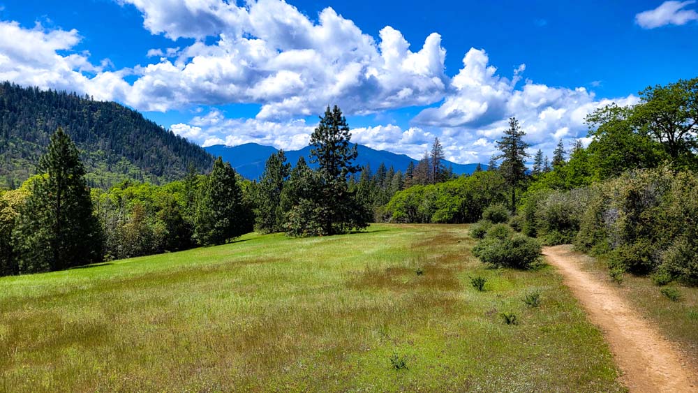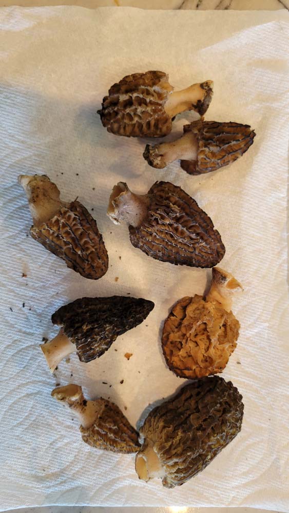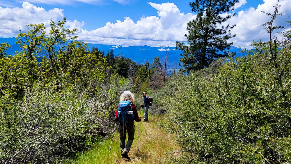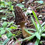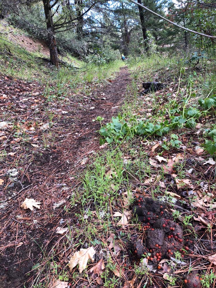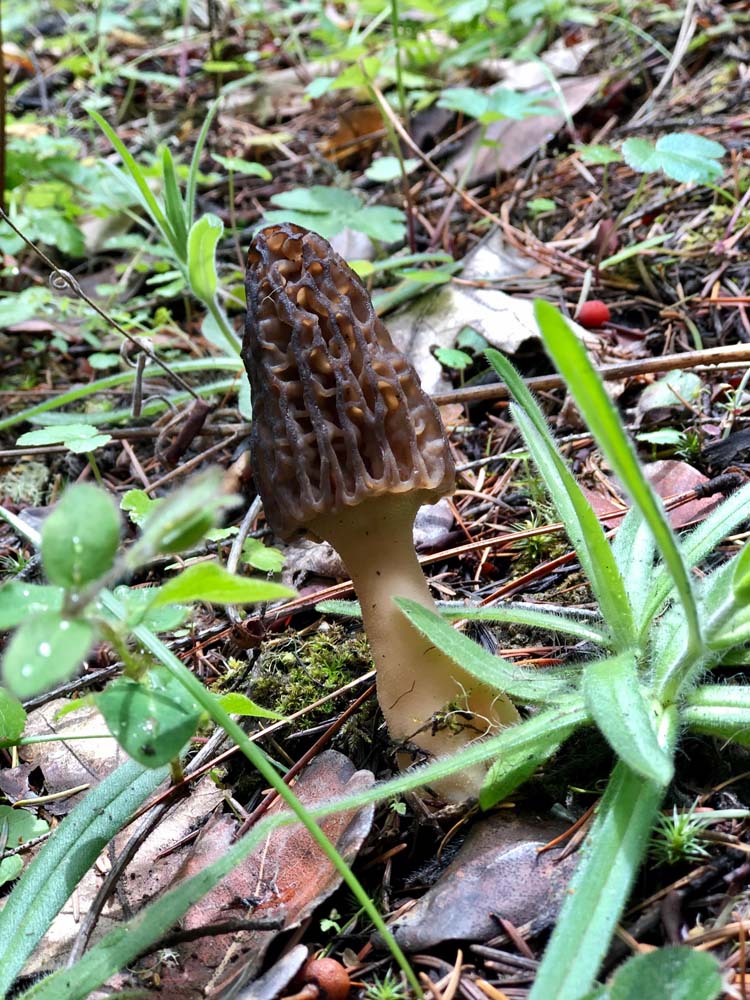 And, the gradient just kept getting steeper. “Just a littler further to the first switchback then we will rest”. Yea we took multiple short breaks and wardrobe adjustments. The steepest grade comes just past the first switchback after which we were rewarded with our first view spot. The sky had opened to full light, with cumulus clouds marching eastward against a back drop of perfect dark, sky blue. And, just at the end of the grade, before the switchback backs to the east, we spotted a lone Morel. My first in 5 years of hiking in Southern Oregon. Not a bad hike. We left it there, and continued up the last pitch through shoulder high deer brush to the saddle.