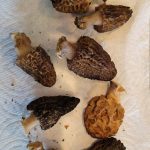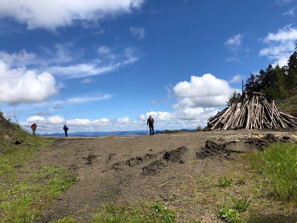 And what a surprise. Recent logging and burning had cleared the entire eastern slope. A tepee 20’ tall of cut logs sat on the pass waiting for a torch. The logging was complete, burn scars and some logging mess extend down for several hundred feet. But the view was exceptional. We found a stack of horizontal logs along the road and sat down for our lunch. We look out across valley to the High Cascades still topped with clouds and down across the Valley of the Rogue State Park and up highway 5. We sat there on the log and enjoyed the view and just as Leslie was pulling out the chocolate, Sherry or Marilyn said “hey there is a morel at my feet”. Then we all started looking around our feet and under the logs. Not long after we had twenty cut and encased in luncheon baggies.