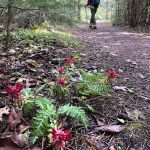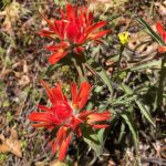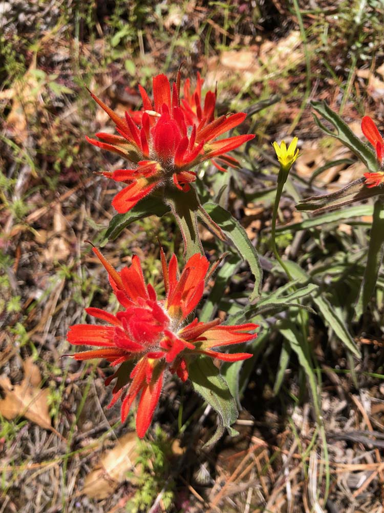 We made about 20 feet and were stopped by red warriors cloaking as flowers, and shortly thereafter, gigantic Trillium and Fairy Bells…. And….and…. This had to be controlled. So, onward to the long gradually steepening trail up the valley floor. The light transition to ray of sunshine bouncing off wet leaves and droplets of dew as the forest transitioned from moss covered oak and madrone to tall stately Douglas Firs.