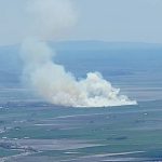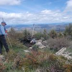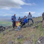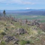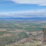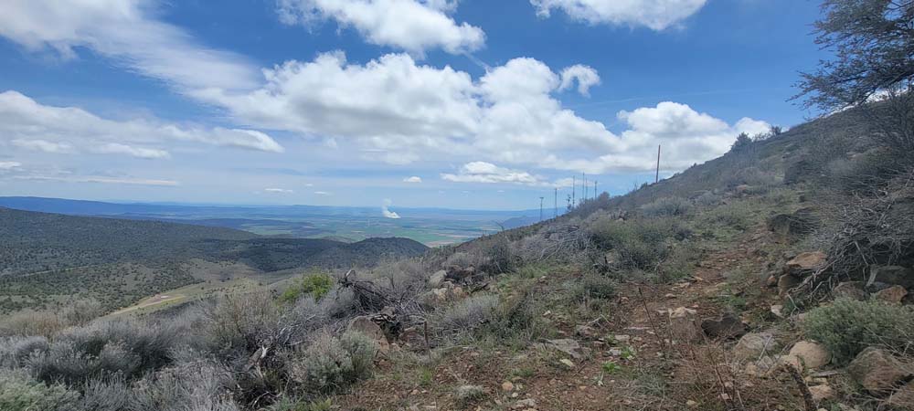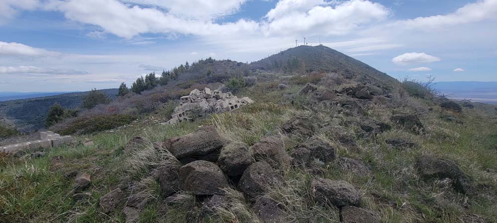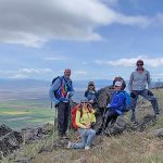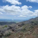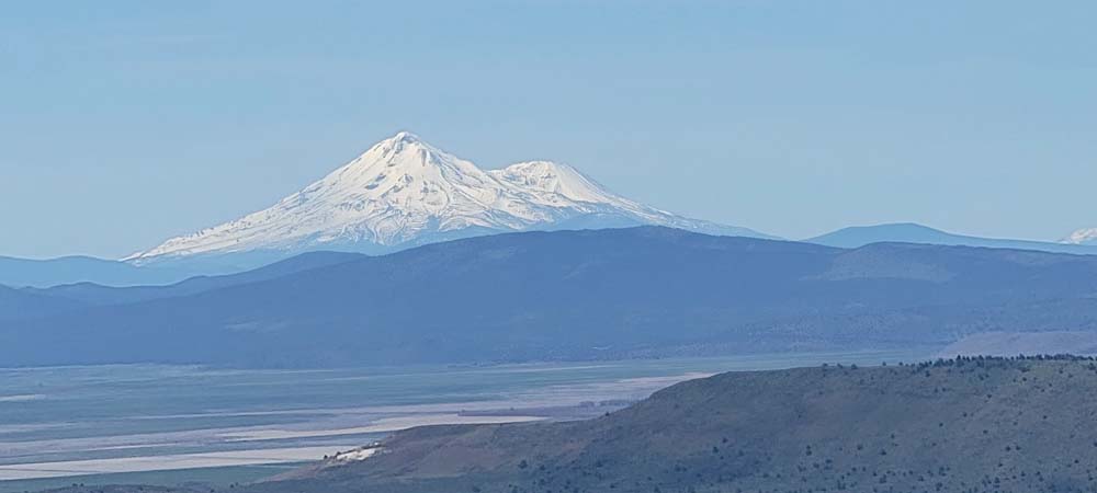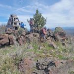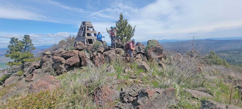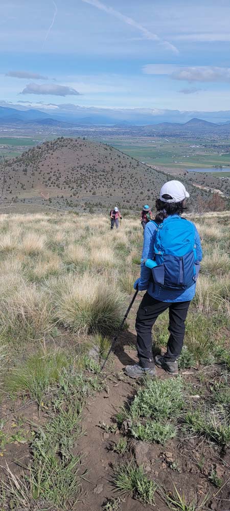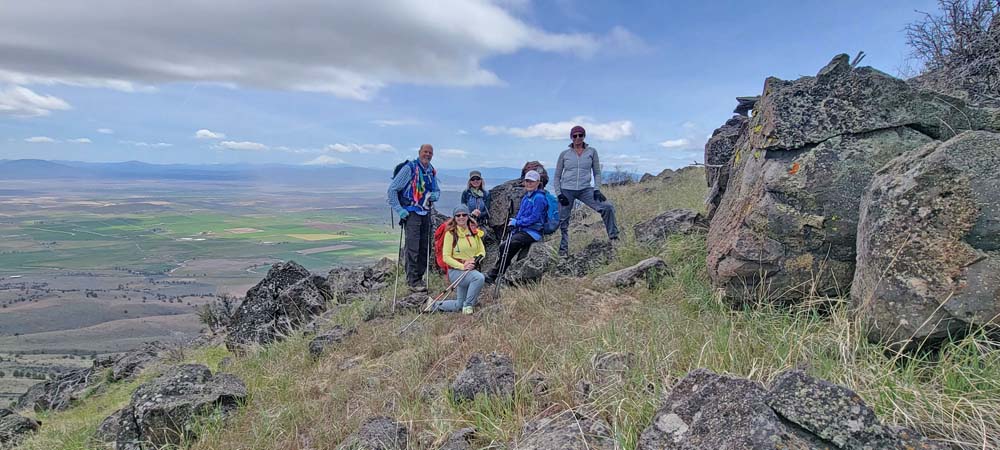 The next section of the hike was down hill and then a steep push to the top where the cell towers are. Leslie and Sherry decided to take their lunch and not join Bob, Ki and myself as we wanted to be able to be on the very top of the mountain. As we went up, we could see a controlled burn off in the distance. We took our lunch on the top and it was quite windy. We surveyed the land below and were all happy that the fields looked green and that the basin must have gotten some extra precipitation this year. The view of Mount Shasta was beautiful as always.