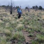 We headed back down then up to meet Sherry and Leslie. They reported that they had seen a snake where they had planned to eat their lunch. Shortly after, we came across another snake. Neither were rattlesnakes. We decided we needed a team effort going back down. I would keep my head down looking for snakes and others behind me would keep an eye out for the yellow and blue pieces of tape. We only got off trail a few times but quickly returned to our path.