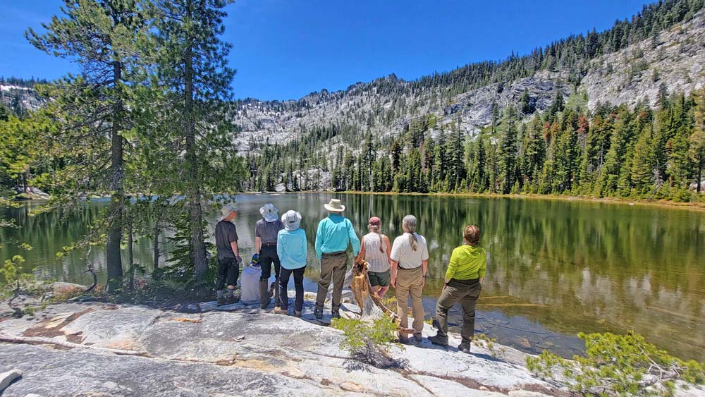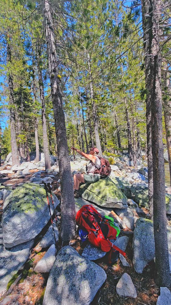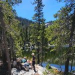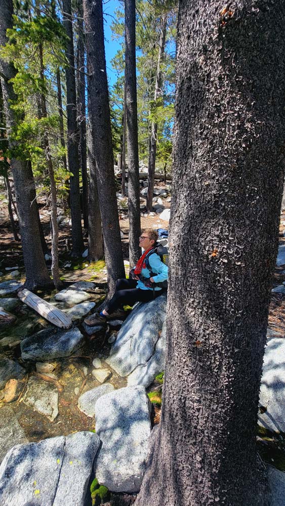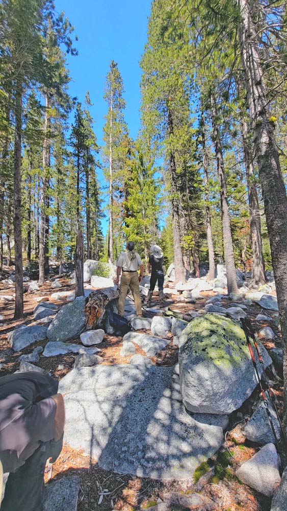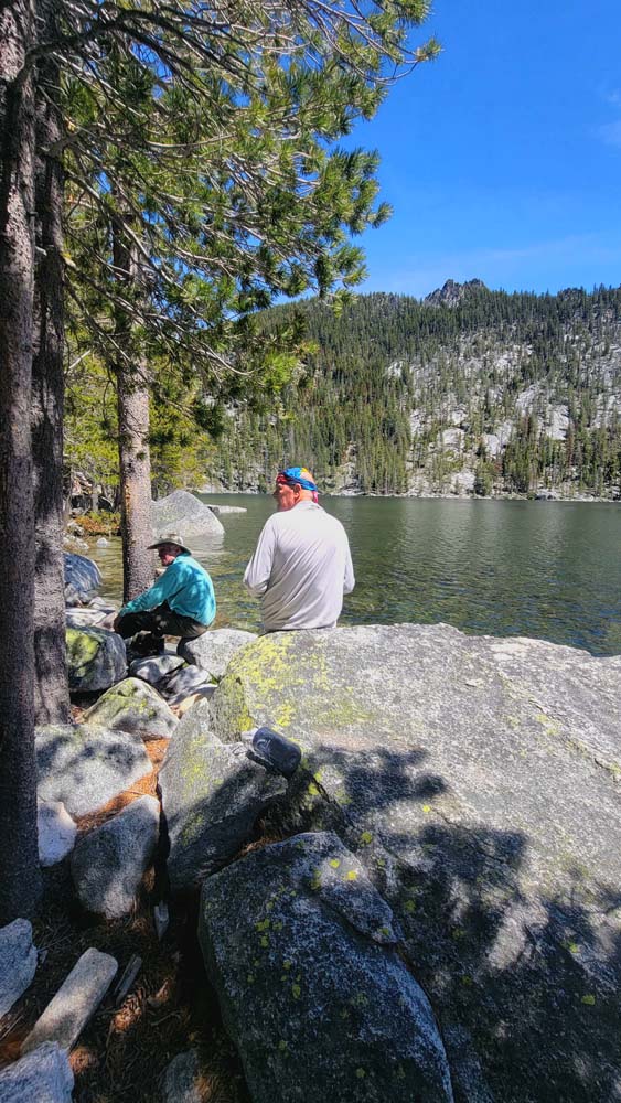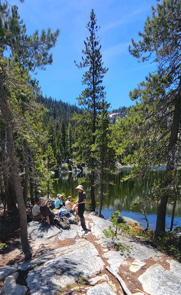 We ended up taking an early break to do wardrobe changes as the temperature was rising. We also were making adjustments to fluid intake and electrolytes as a couple of hikers started to experience muscle spasms and leg cramps. We stopped at the split in the trail that heads up to Little Duck Lake and decided we should have lunch there. The sun glistened off the water and made our lunch view beautiful.