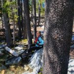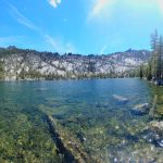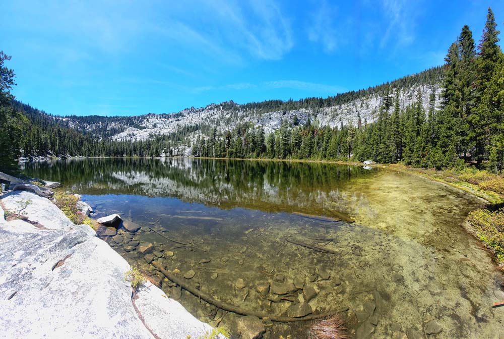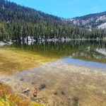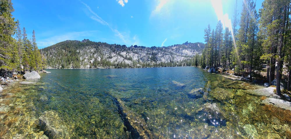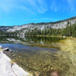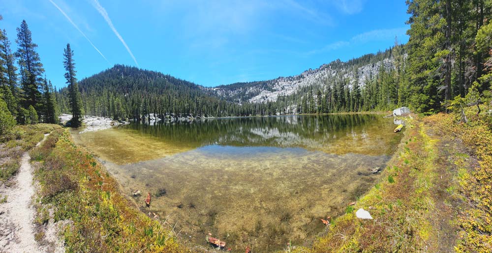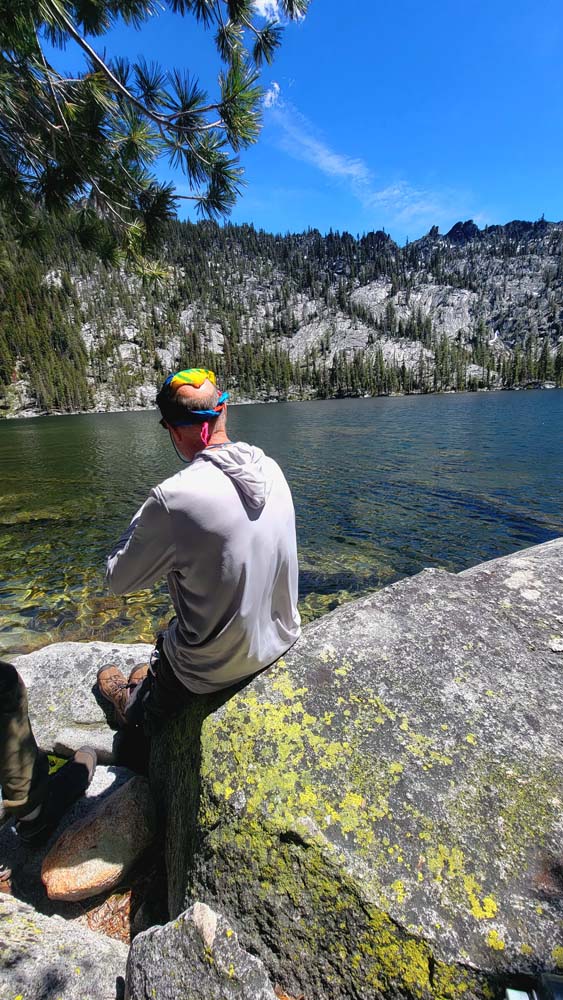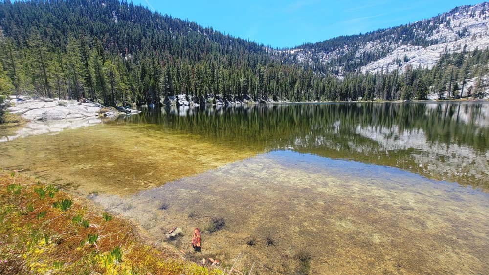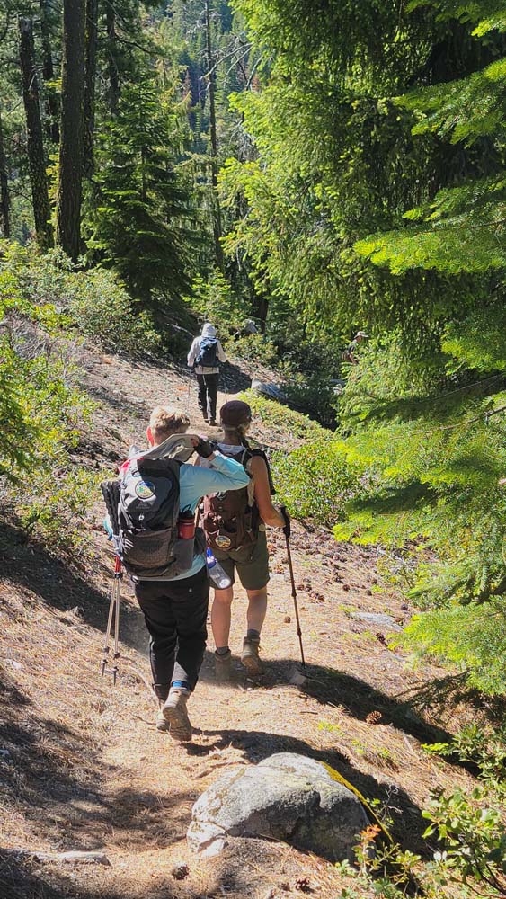 We ended up taking an early break to do wardrobe changes as the temperature was rising. We also were making adjustments to fluid intake and electrolytes as a couple of hikers started to experience muscle spasms and leg cramps. We stopped at the split in the trail that heads up to Little Duck Lake and decided we should have lunch there. The sun glistened off the water and made our lunch view beautiful.