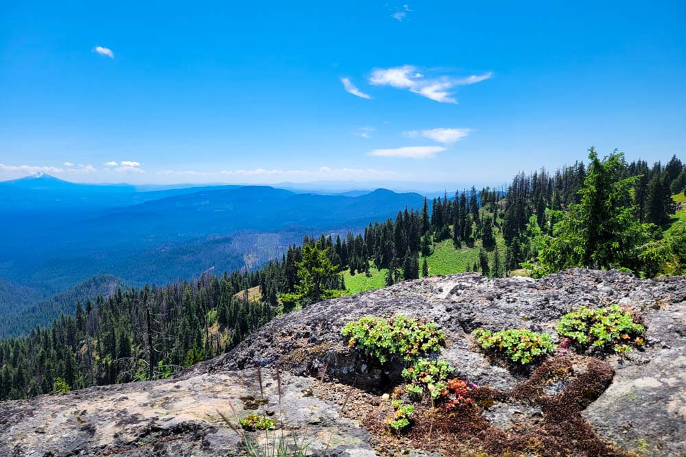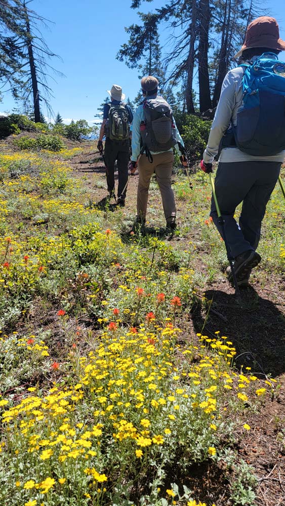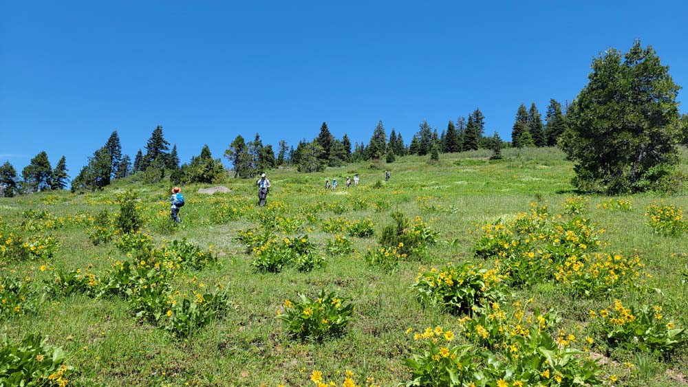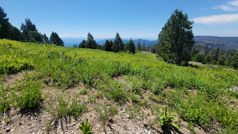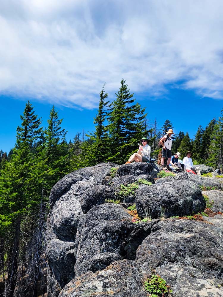 We saw many wildflowrrs as we made our way through the overgrown trail. We went up to Abbott Butte to see a pile of wood where the lookout once stood. After a snack break, we bushwhacked for about 15 minutes and came to a rock outcropping. It was there that the others decided they wanted to have lunch and not continue to Elephant Head.