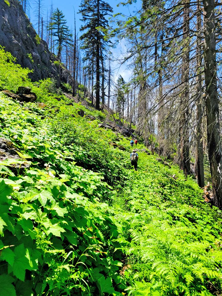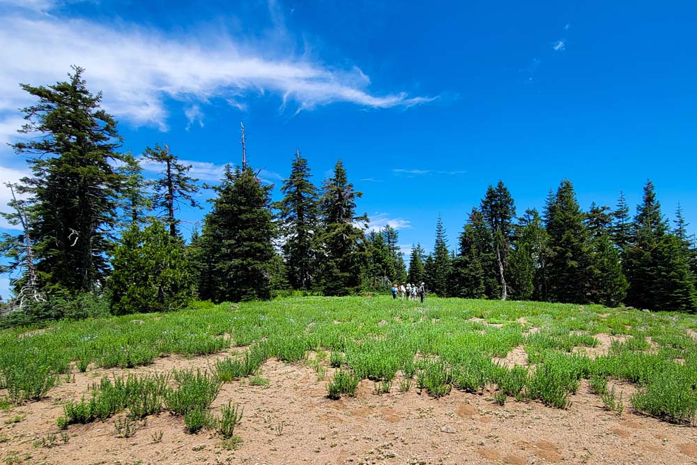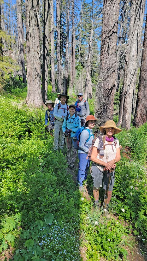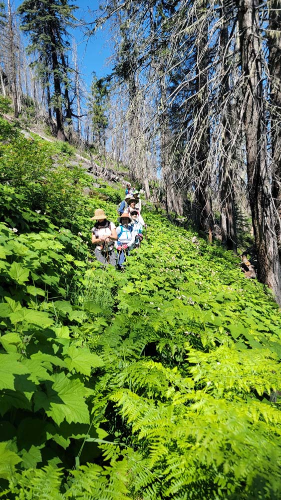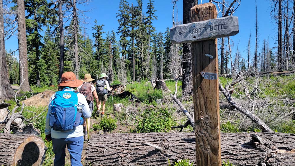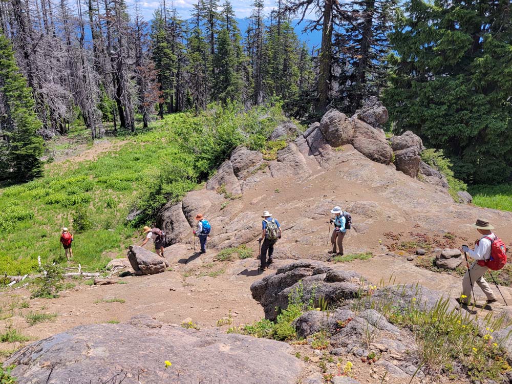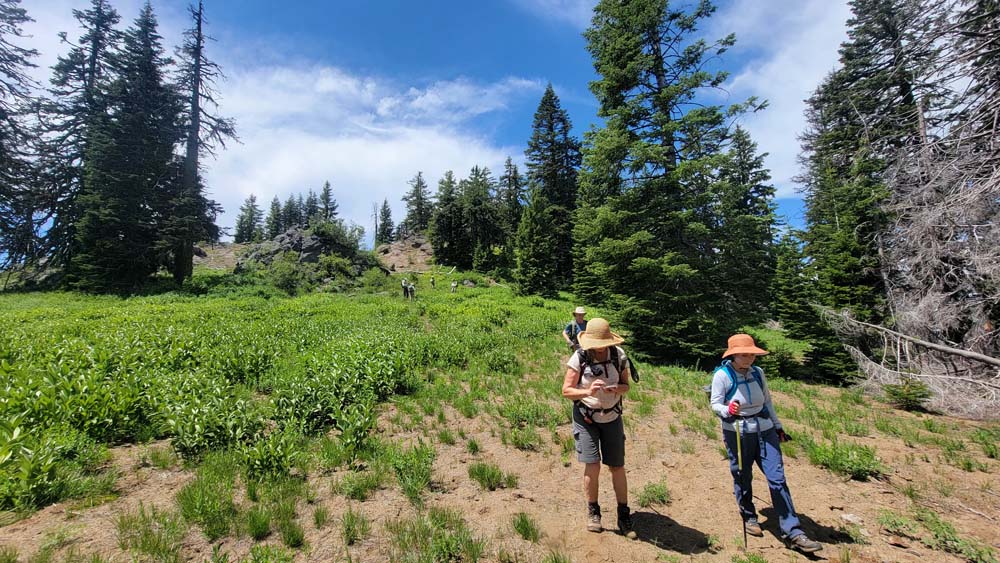 There were 8 people who started from the Abbott Butte trail in nice 72 degree weather. There had been a fire some years back and many snags were left standing. Some had fallen across the trail. Fireweed was everywhere but not blooming yet.