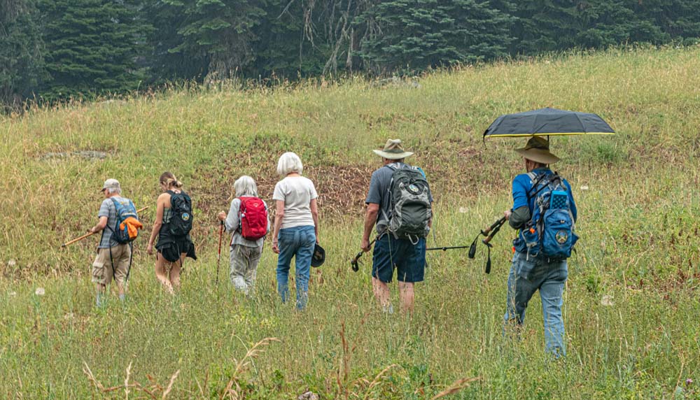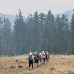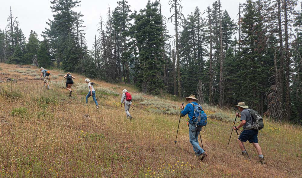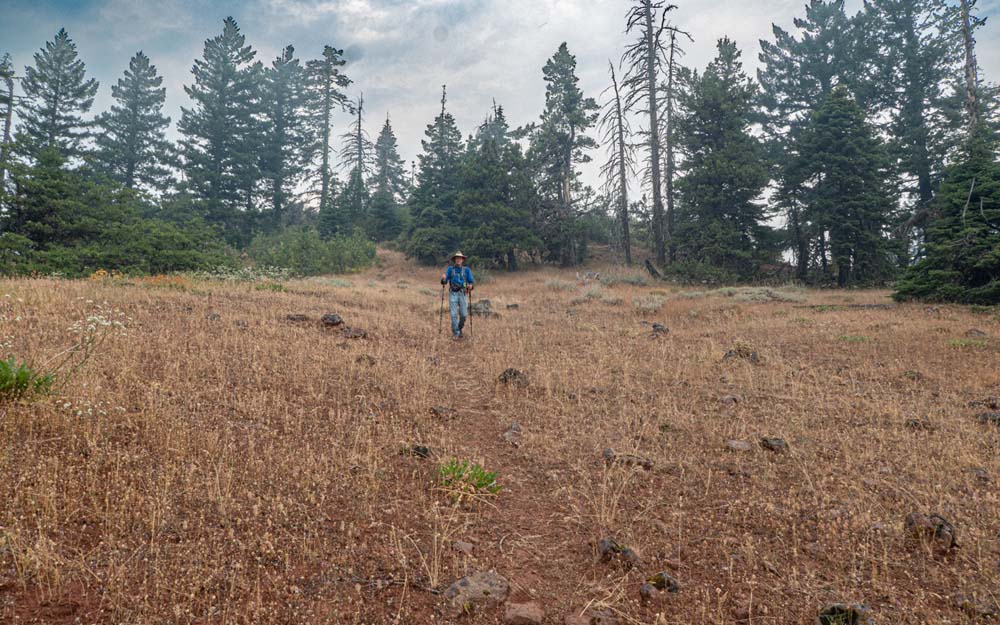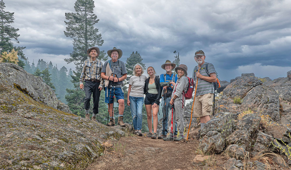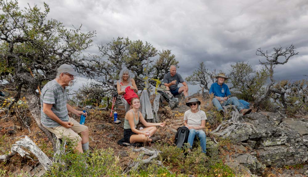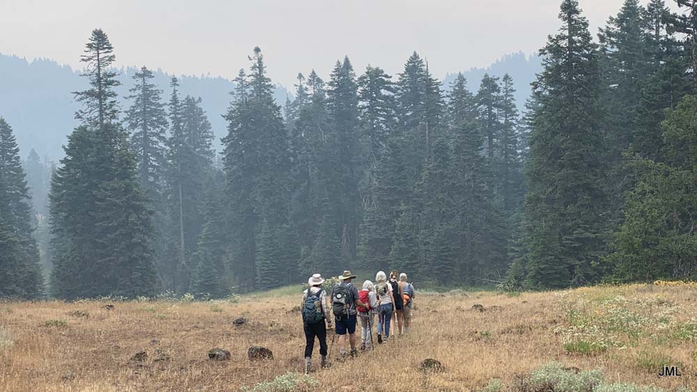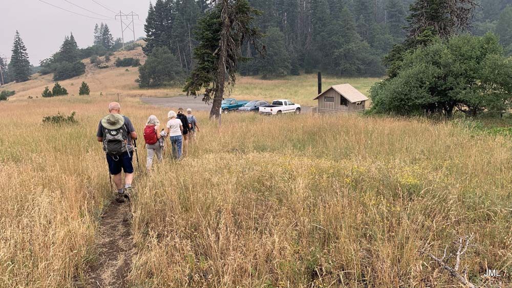 It was strangely humid in Ashland Monday morning; a result of a week-long heat wave that led to thunderstorms and a growing fire that filled the valley with smoke. Still it was business as usual in the Rite Aid parking lot as we greeted arriving hikers. Our friend Phyllis brought her granddaughter Sarah, a lovely and pleasant college student visiting from San Marco, Texas. After Sarah signed the waiver, becoming perhaps the youngest member of the AHG at 19; we drove up Highway 66 to the Greensprings summit towards our hike to Little Pilot Peak.