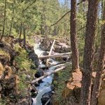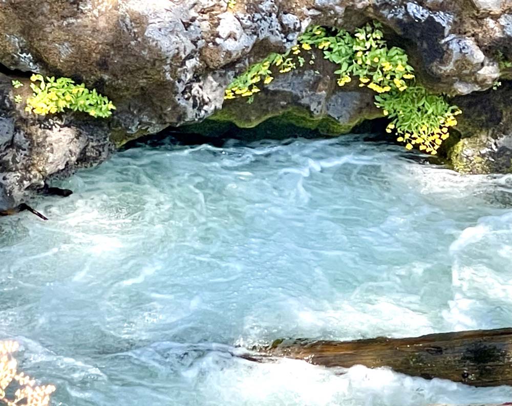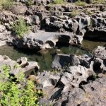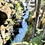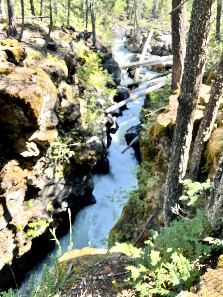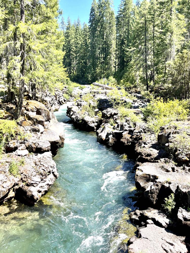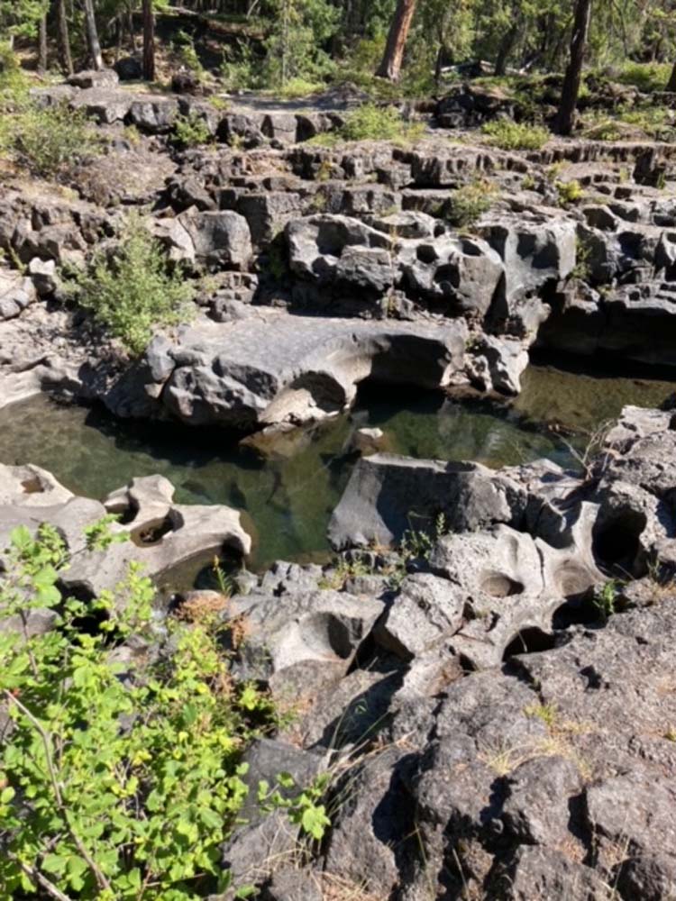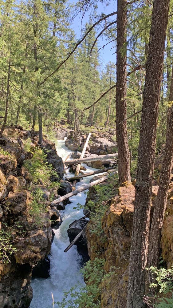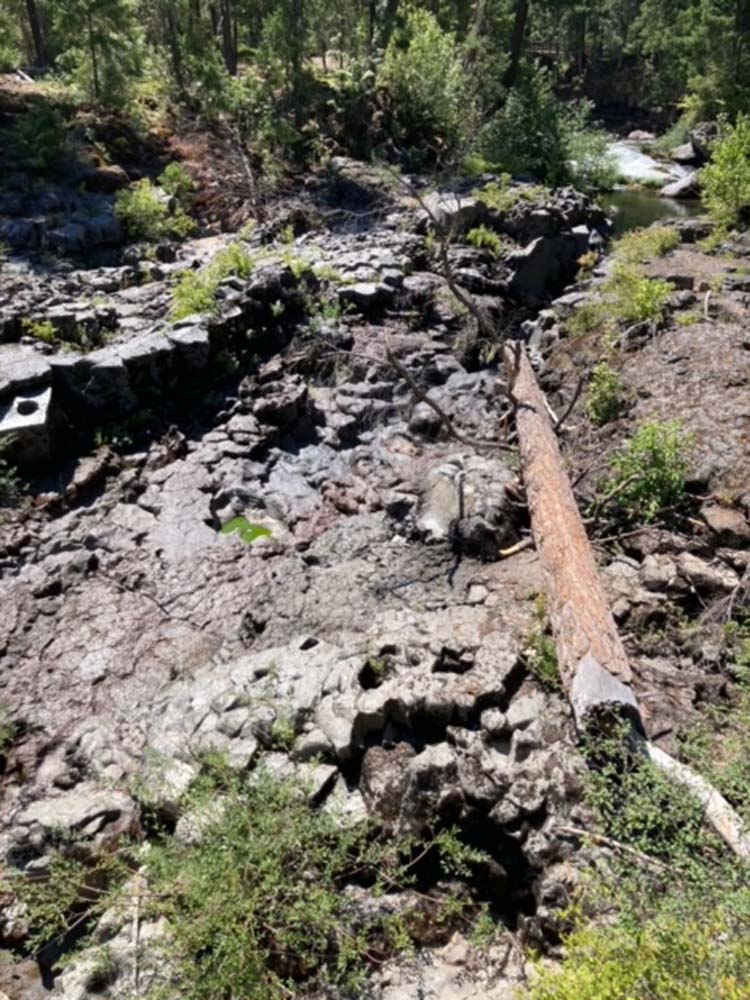 The morning was cool and clear as we watched the river squeeze through the gorge from several viewpoints. Then we followed the fence downstream from the gorge and onto a lava strune trail into a shady forest along the river.