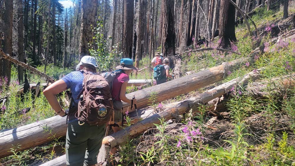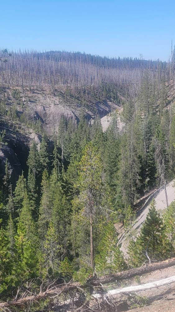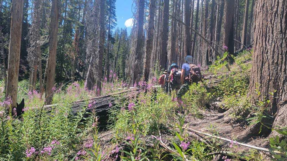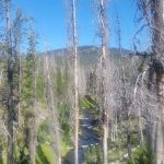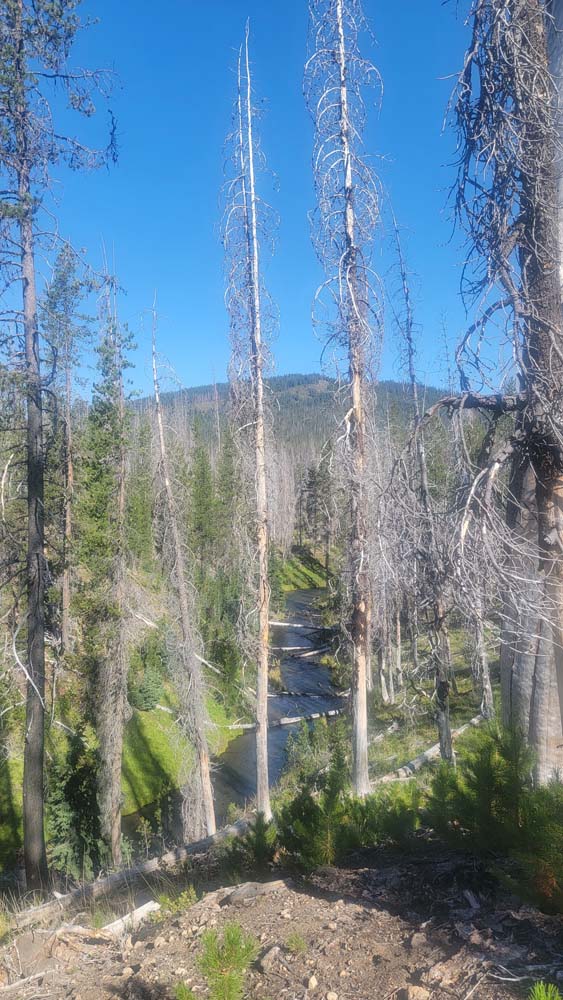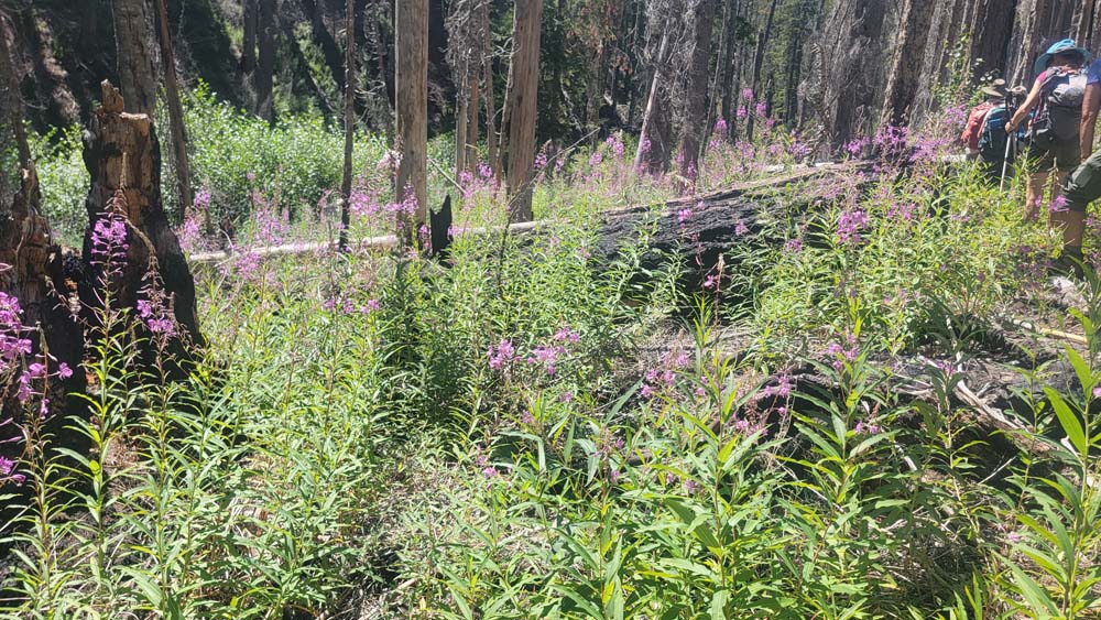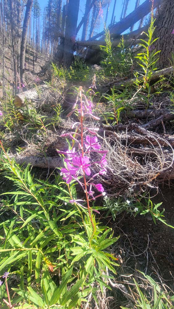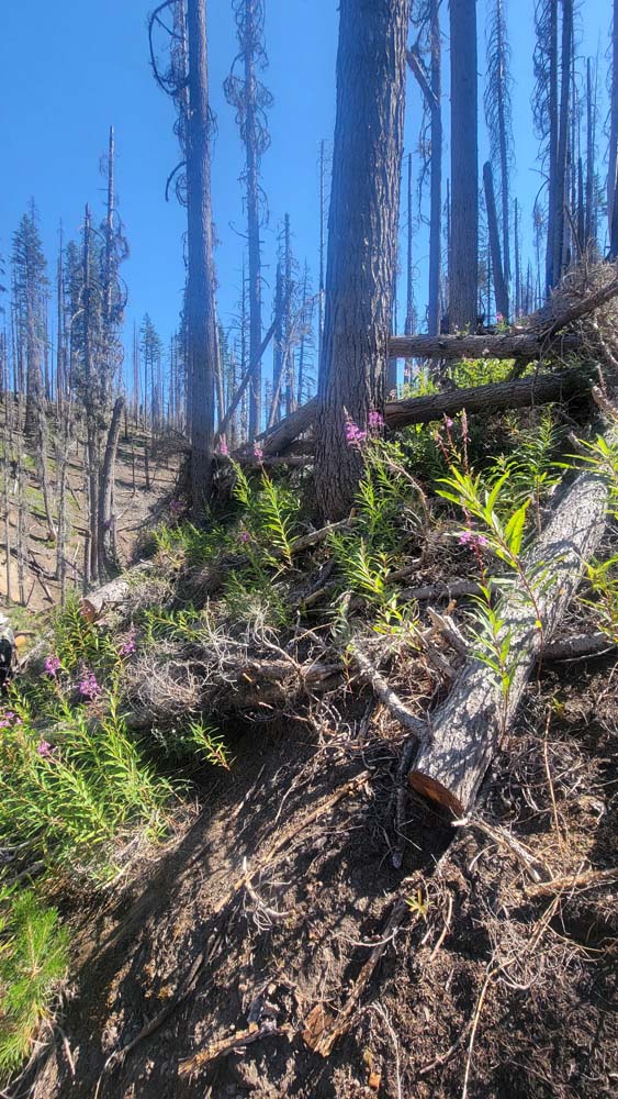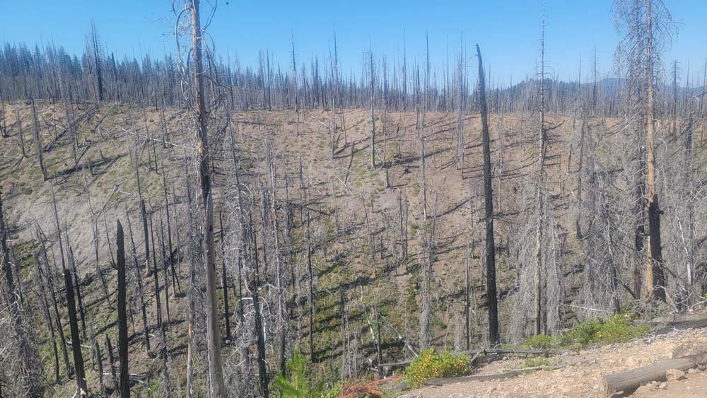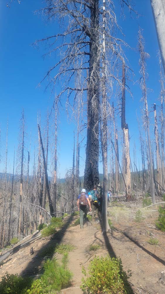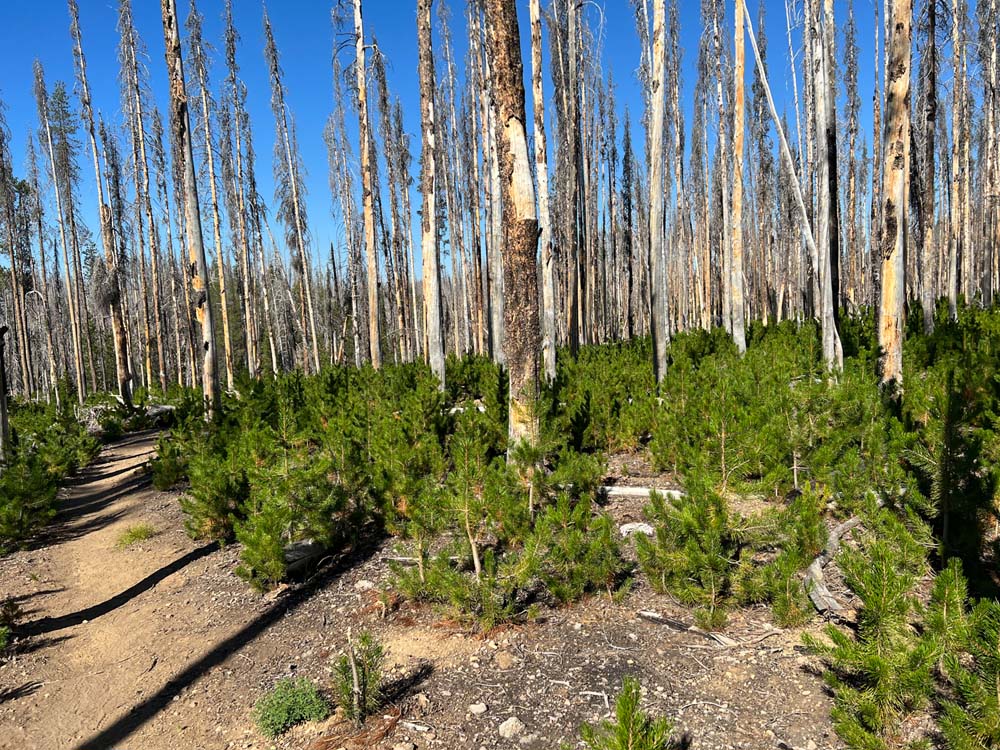 The trail was in good shape with lots of 3 to 4 foot small lodgepole pine trees coming out of the ashes from the fire in the area. As we
