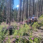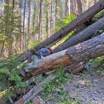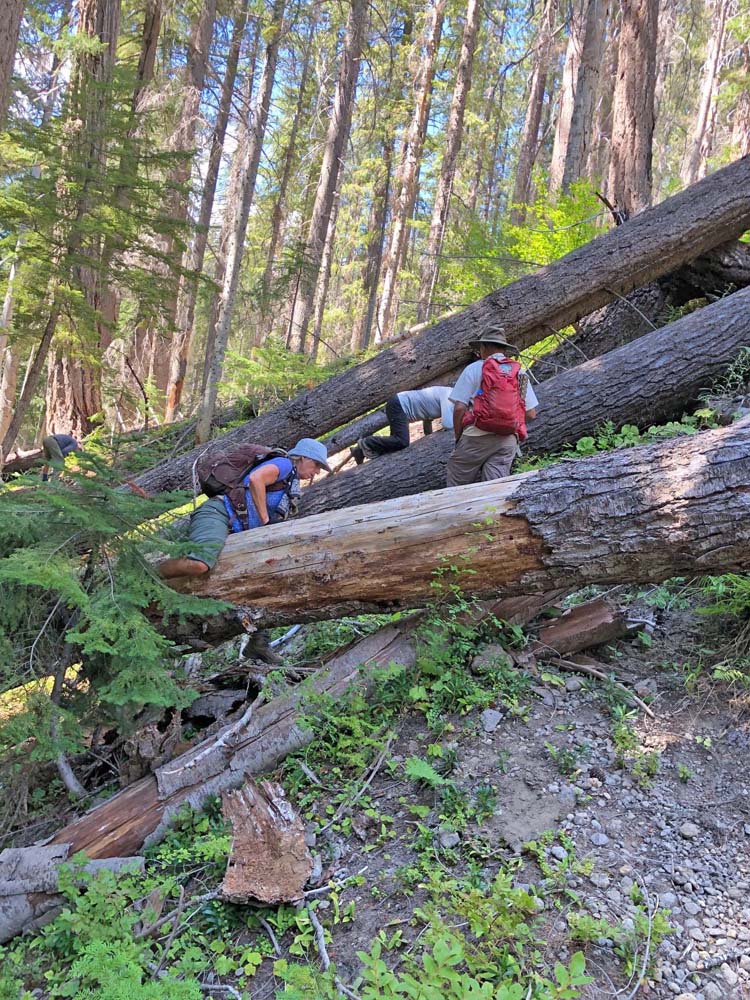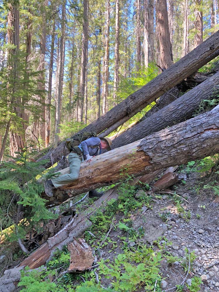 That was as good as it got. After that point we were climbing though, over and under fallen trees and overgrown bushes, hoping that we would get through the next ¼ mile and the trail would re-appear. However, after over 2.5 hours we gave up and decided to climb out of the canyon (think ½ mile bushwhacking up a 45 degree slope) and hiked to the highway. Then 3 volunteers hiked to the shuttle car which turned out to be 3.5 miles away.