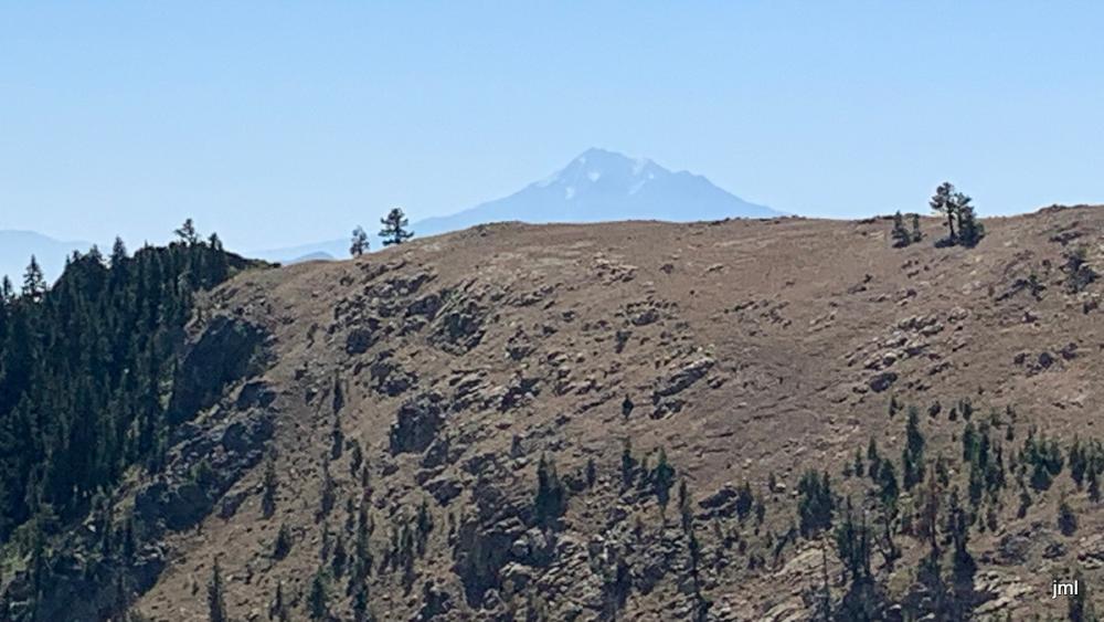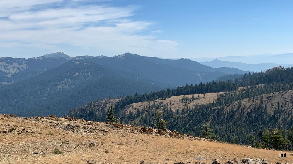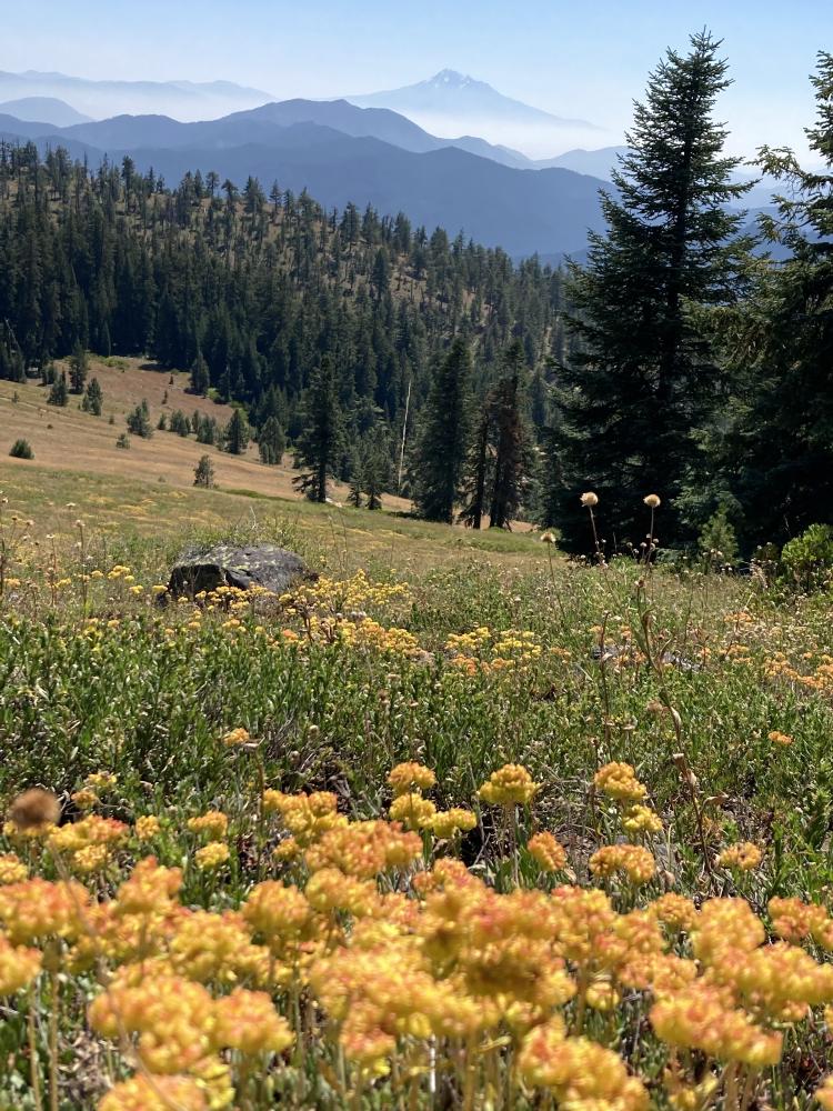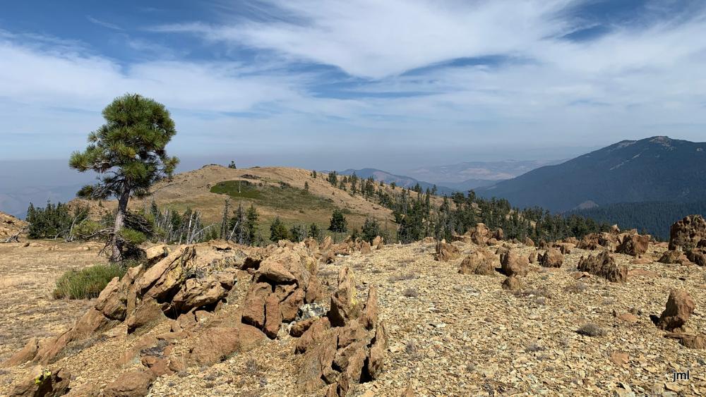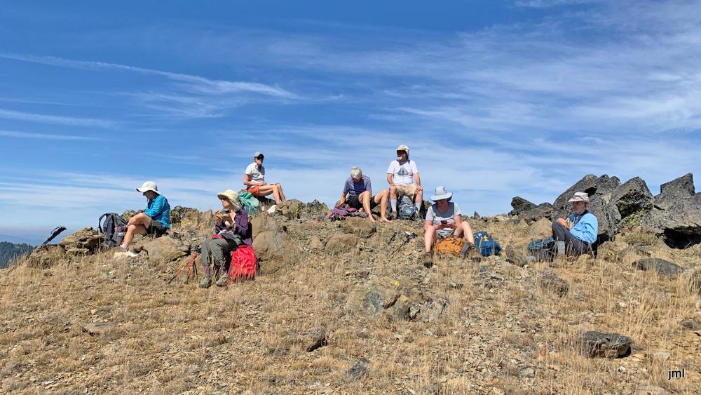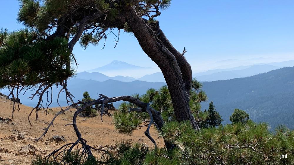 With the summit in sight we scrambled up from the trail to our lunch spot at over 7,000′. From there we could see Mt. Ashland and Pilot Rock to the east and Mt. Shasta through haze to the south. The view to the north was sad with smoke moving into the Rogue Valley and beyond that thick smoke from Rum Creek spreading across Josephine County.