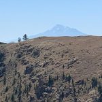 The PCT takes off from parking heading uphill through shaded forest. The first half of the hike is a steady climb, so we made several stops to catch our breath and take in the views of Wagner Butte, Mt Baldy and Anderson Ridge. In the hazy distance, we could see Roxyann and the top of Mt. McLoughlin rising over Wagner Gap.