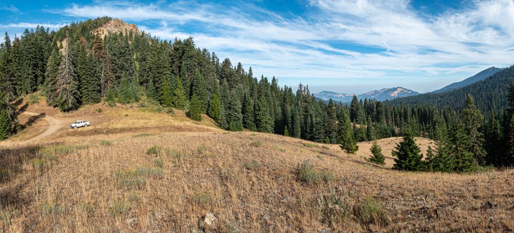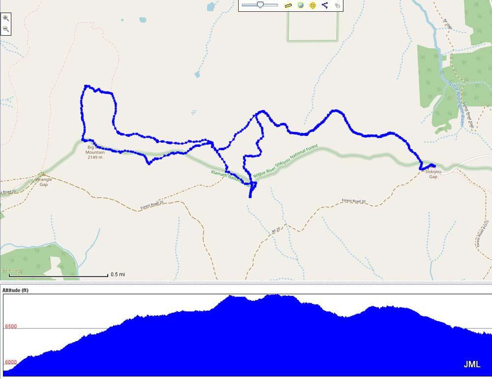 The road up into the Siskiyous is a long and dusty 18 miles; finally coming to the T of FS22 and FS20. A right turn onto FS20 for the last 0.8 rough miles out to parking at Siskiyou Gap (5800′). Our group was glad to get out and stretch their legs after the long ride up.