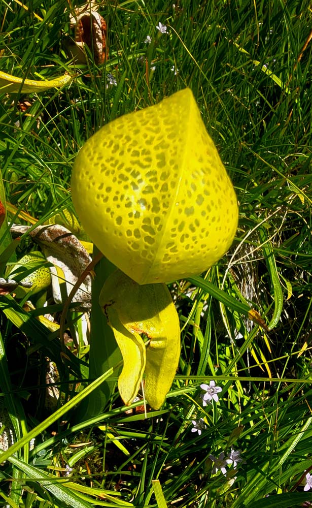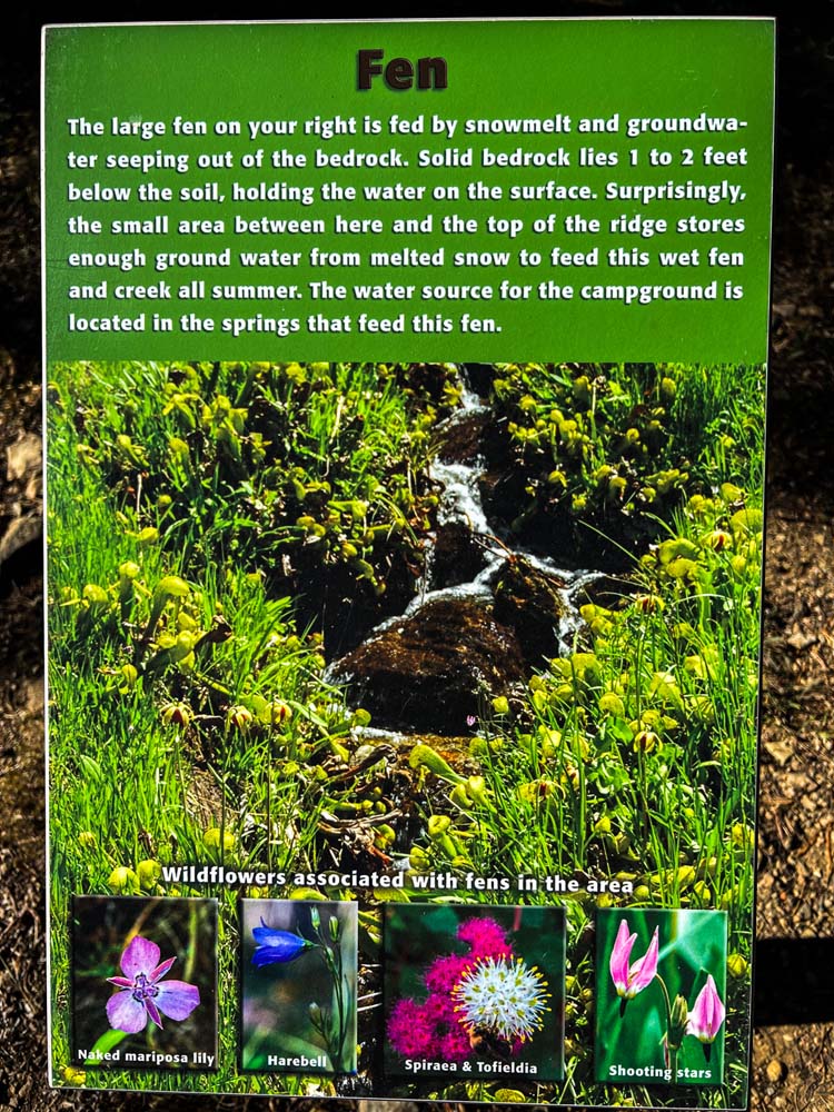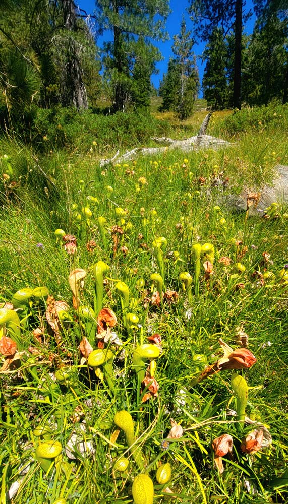 June and Jerry went swimming, so the rest of us got to take some extra relaxation time during lunch. We did learn what a Fen was and saw many patches of California Darlingtonia plants in Fens along the trail. One of us opened up a plant to see what it looked like inside (lots of dead bugs). When we got back to the car, Leslie provided us with home grown grapes, which was a great hit. Overall it was a great day.