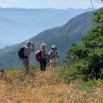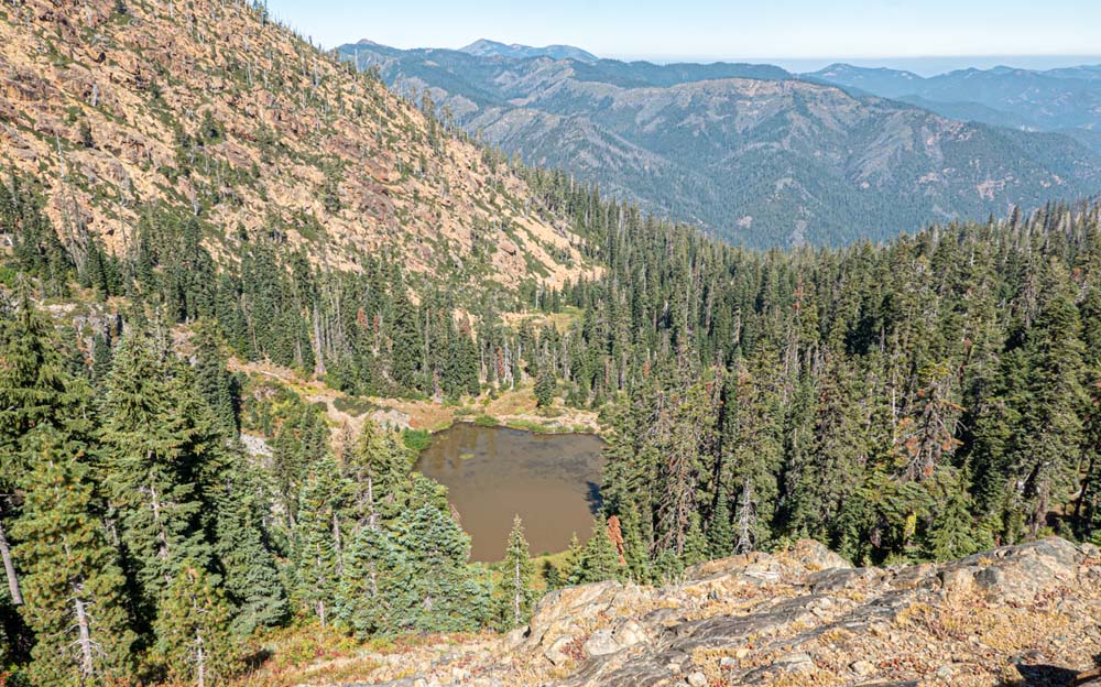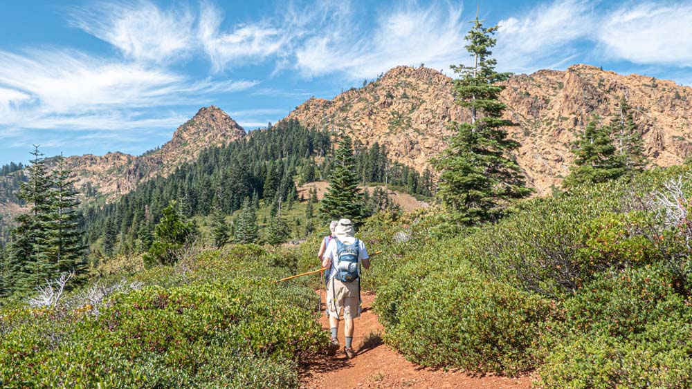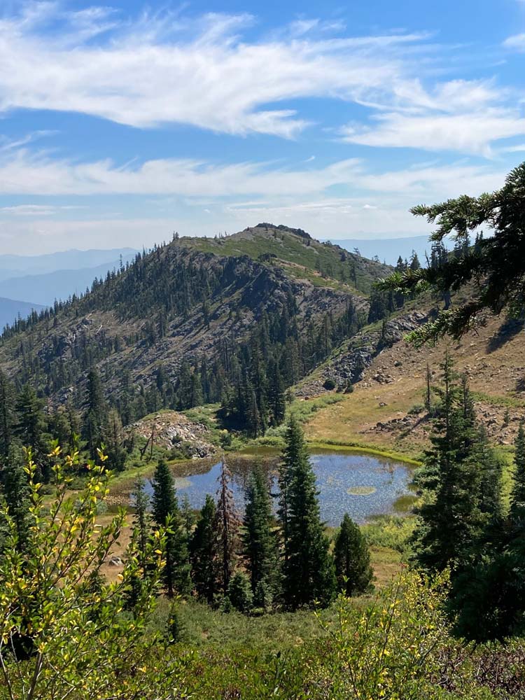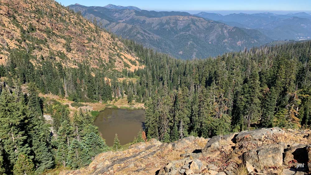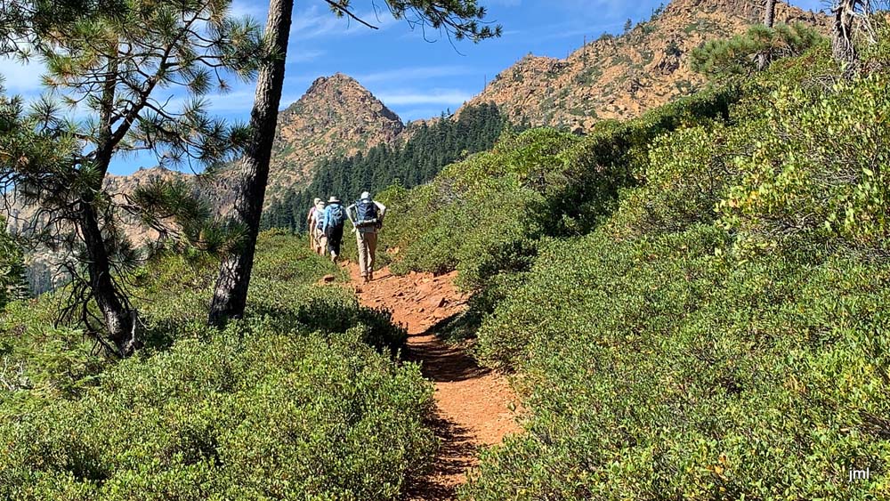 Distant views were covered in haze probably coming from the Mountain fire in California, but our views on and off trial were spectacular! We had overhead views of both Echo Lake and Lily Pad Lake (covered with the floating aforementioned flowers). And, of course, the majestic Red Buttes were a breathtaking sight to see as we turned north up the trail. The PCT winds around the base of the Buttes, then looks down on Lily Pad and finally a short uphill delivers us onto the old forest service road and a left turn towards the gate and lunch!