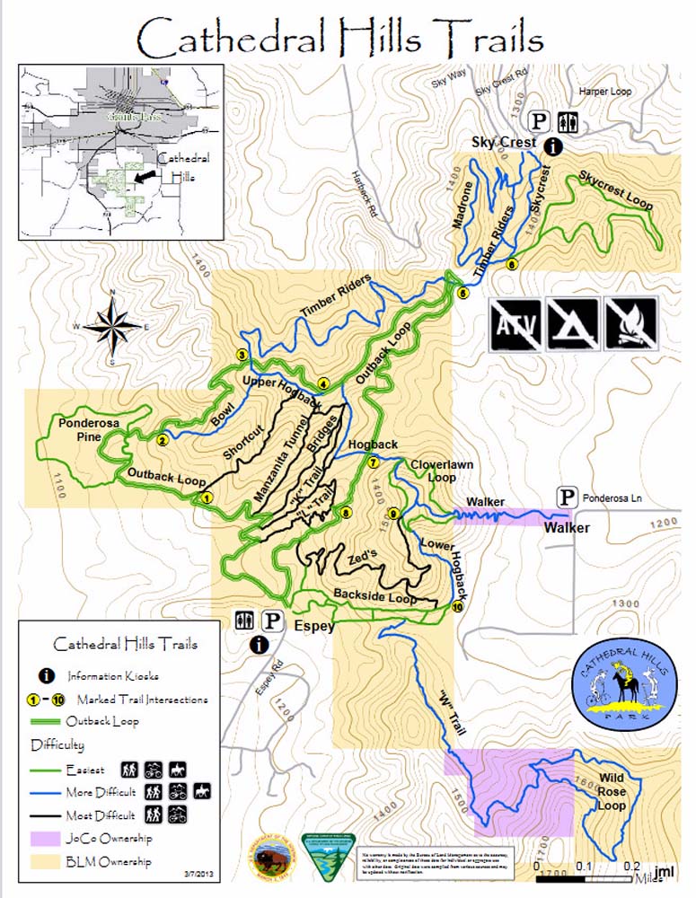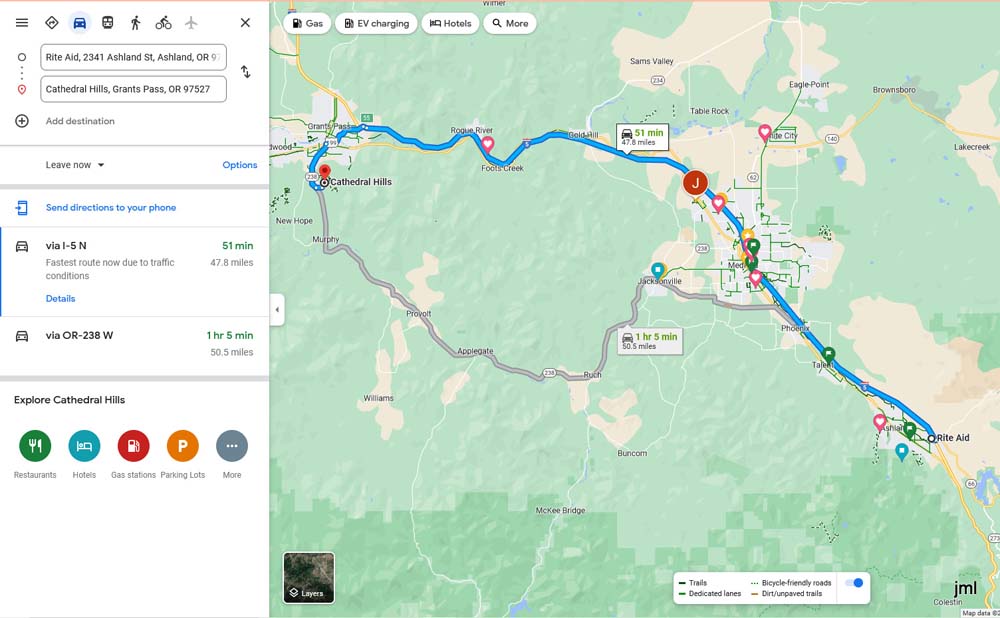 Note: Cathedral Hills is a pleasant spot with many trails to add miles and elevation. There’s plenty of shade for warm weather hikes provided by Madrones, Manzanitas, white and black Oaks. For a more leisurely and scenic return to Ashland, turn left instead of right when Espey Road meets Highway 238 and drive down through the Applegate Valley to Jacksonville then on to Ashland.