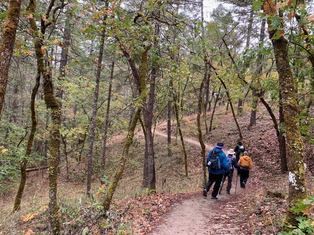 Under threatening skies we headed up to Grants Pass for a tour of the trail system known as Cathedral Hills. This hike was on our Monday schedule for the first time. Though it was rainy off and on driving up from Ashland, on the trail it was a light drizzle that stopped completely after lunch.