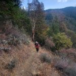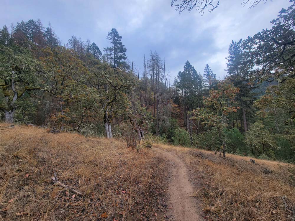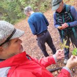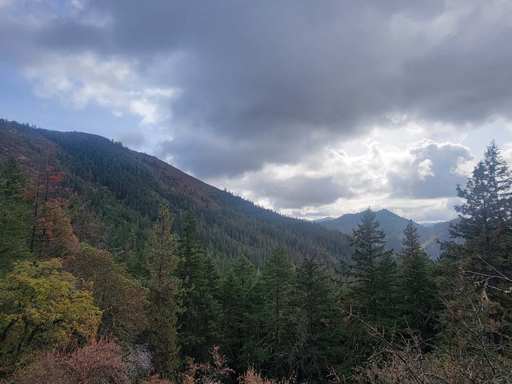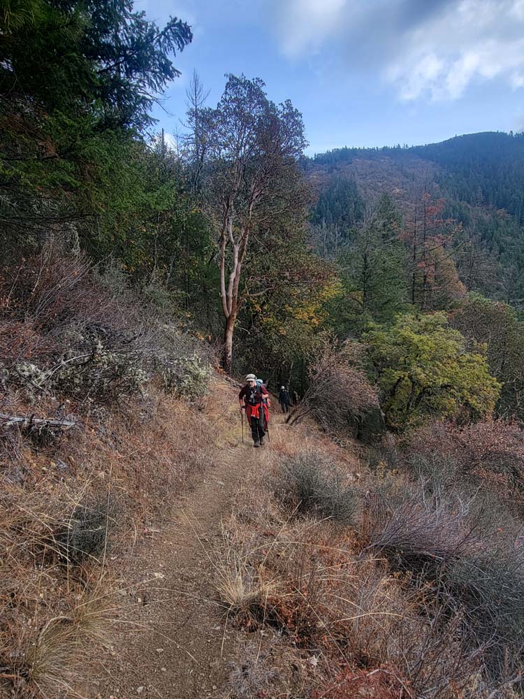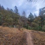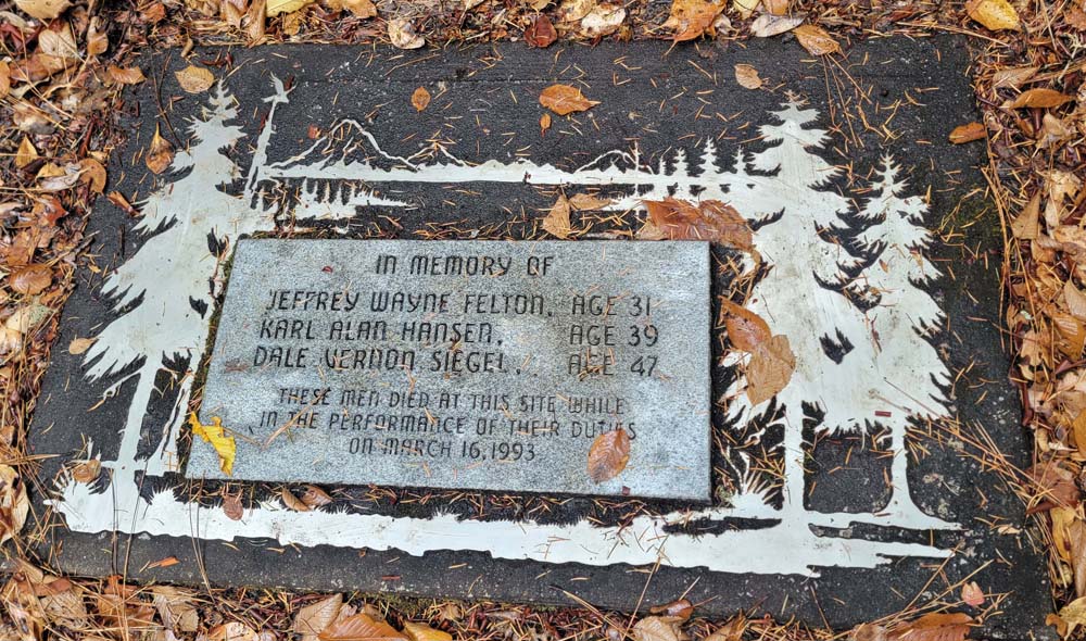 We headed up along the trail and were surprised to see that the big leaf maples were still mostly green. Just shy of 1 mile, we took the Felton Memorial trail to the right and hiked for 1.5 miles. We passed a group of 6 that said a neighbor in the area had come down and showed them pictures of a bear from his trail camera. We had seen scat and several places where it looked like the dirt on the side of the trail had been disrupted. When we got to the plaque memorializing the 3 men, we talked about how they had died in the performance of their duties. We took our packs off and had a snack.