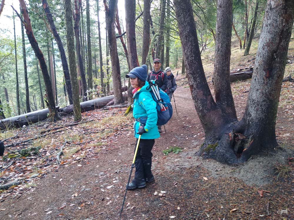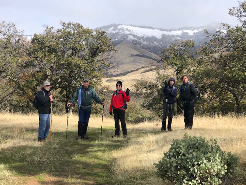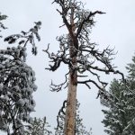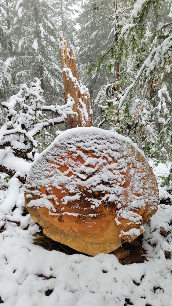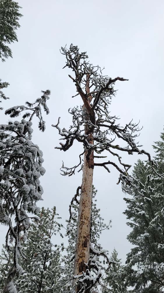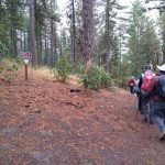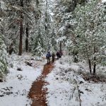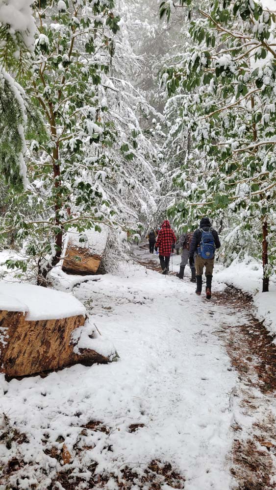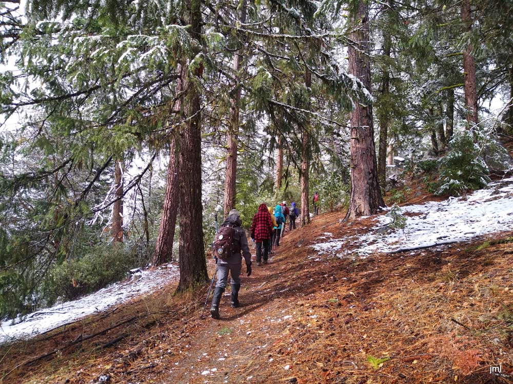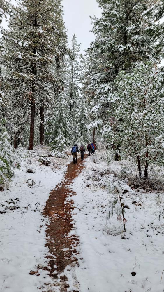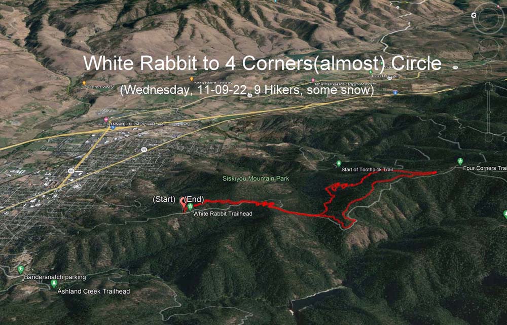 Nine of us took advantage of Wednesday’s rain free forecast and ventured into the Ashland Watershed in search of the snowline. We eliminated 1,000’ of elevation by parking at the White Rabbit trailhead at 3,150’, and headed up familiar trails (White Rabbit to Catapillar and Toothpick) to pick up the Catwalk Trail. Catwalk Trail is part of Ashland’s Crest to Peak trail system, but also permits downhill bikes. The trail climbs 900’ to 4,300’ where it intersects Marty’s trail. (We found the snow line at about 4000’.)