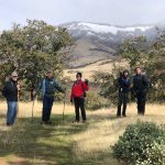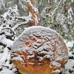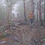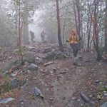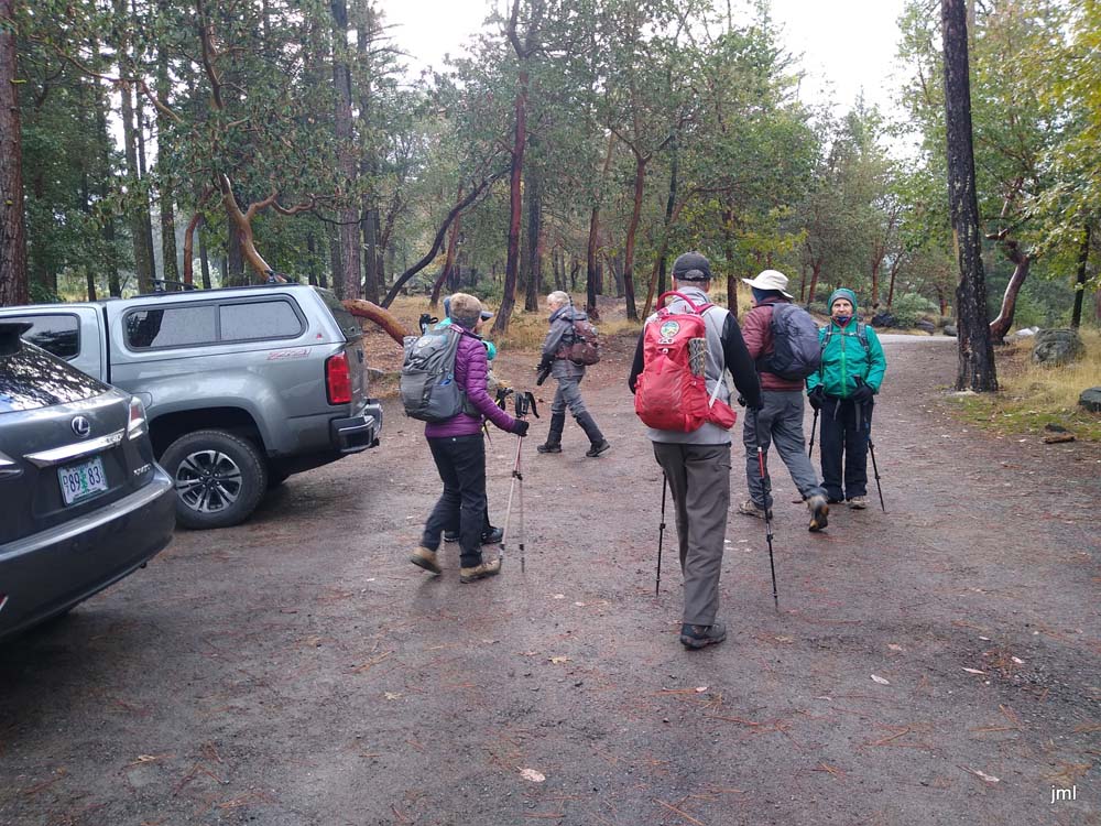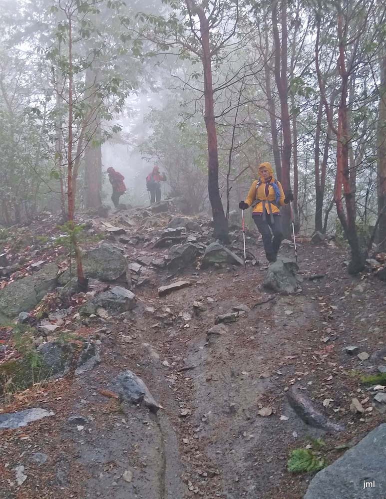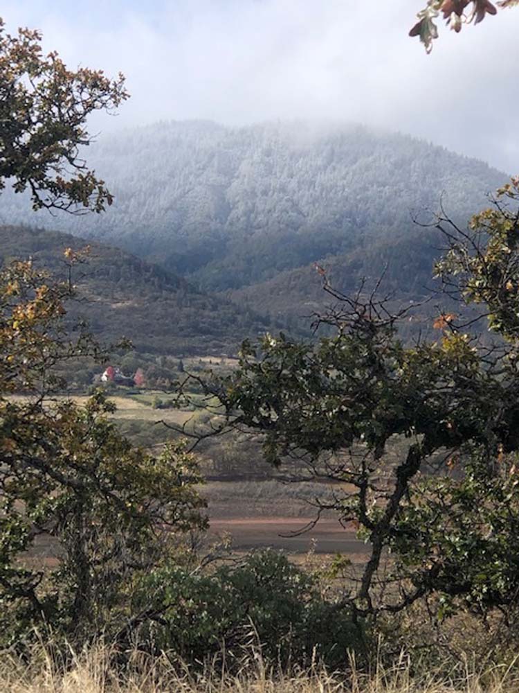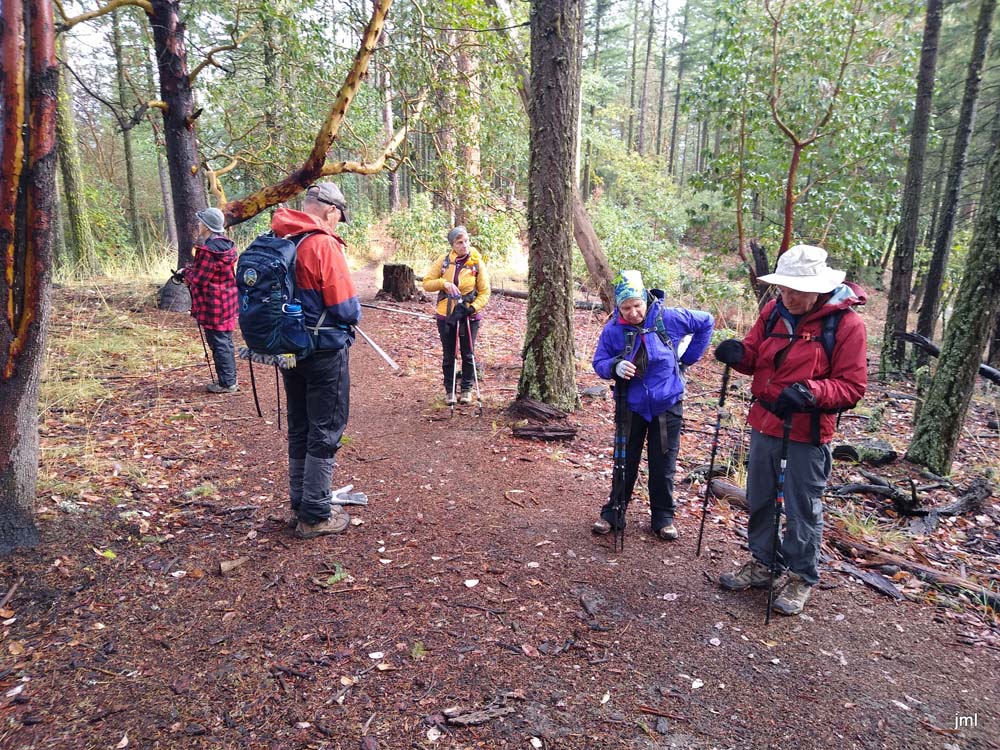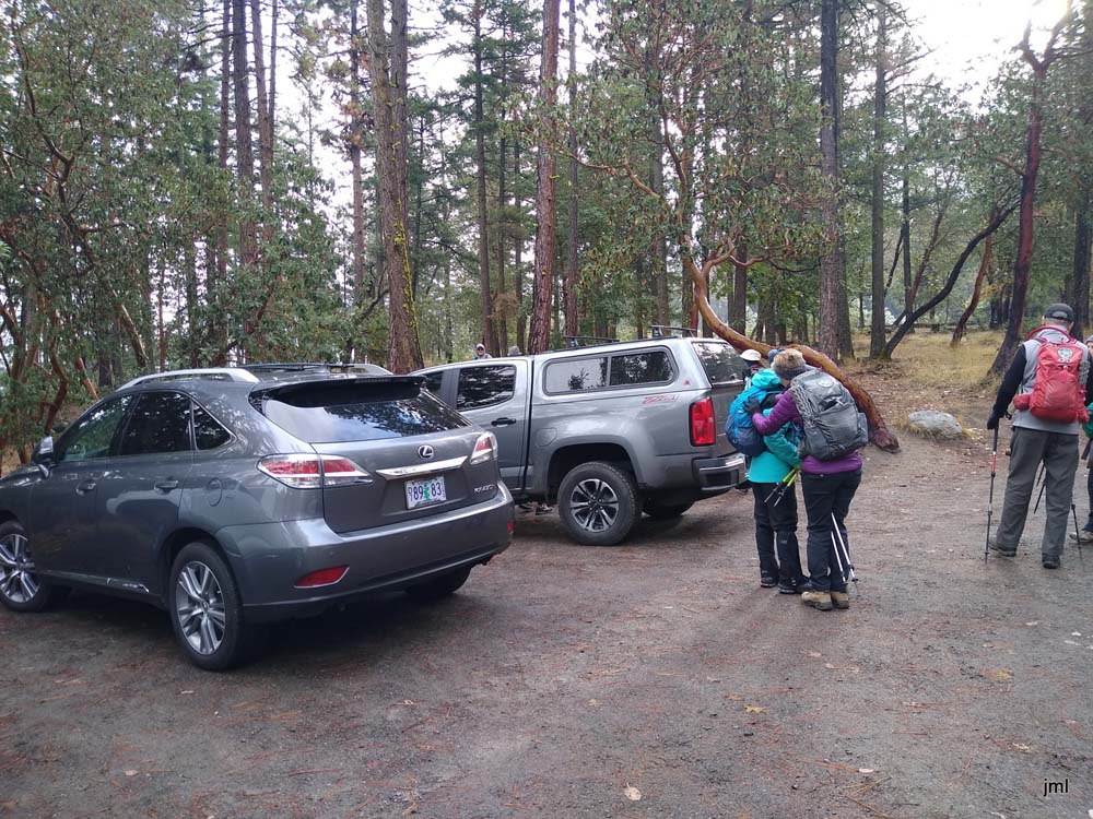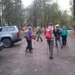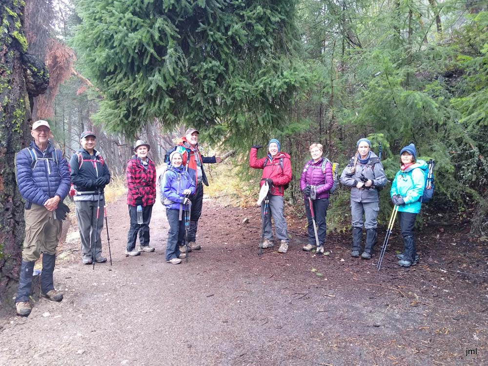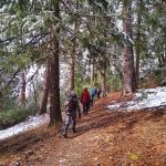 Nine of us took advantage of Wednesday’s rain free forecast and ventured into the Ashland Watershed in search of the snowline. We eliminated 1,000’ of elevation by parking at the White Rabbit trailhead at 3,150’, and headed up familiar trails (White Rabbit to Catapillar and Toothpick) to pick up the Catwalk Trail. Catwalk Trail is part of Ashland’s Crest to Peak trail system, but also permits downhill bikes. The trail climbs 900’ to 4,300’ where it intersects Marty’s trail. (We found the snow line at about 4000’.)