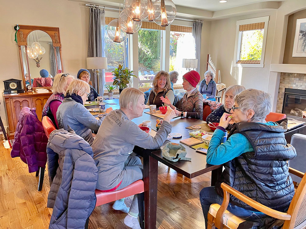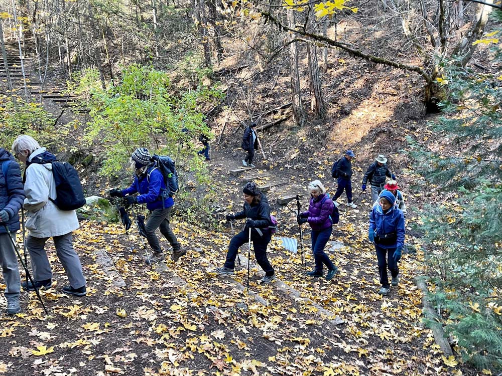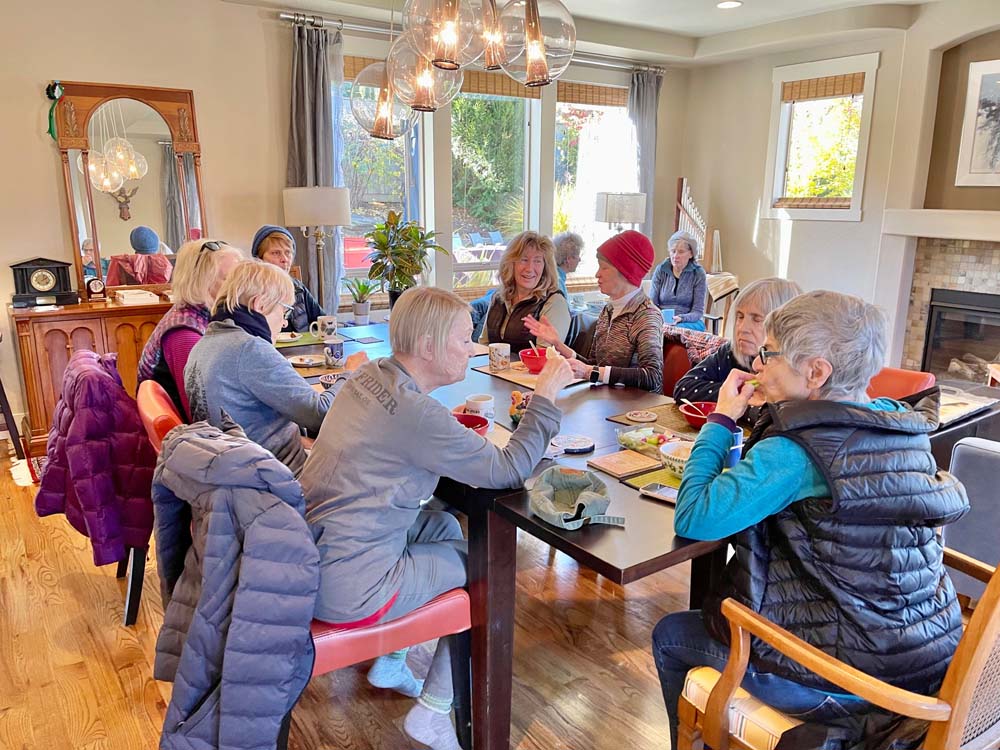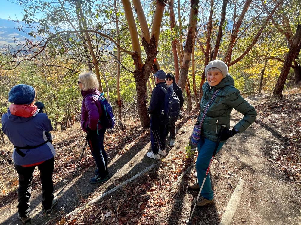Walking down Clay to Chitwood Lane and Kay’s home for our Thanksgiving expression of thanks to our hikers. We’d covered 4 miles and 670’ elevation gain. Eight or so other Friday Mod hikers joined us for lunch. Kay and husband George served warm chili packed with lovely vegetables and beans along with bread and mulled spiced cider. Some hikers contributed cookies and apple crunch for dessert. We enjoyed the opportunity to talk with one another and get into the spirit of Thanksgiving time.