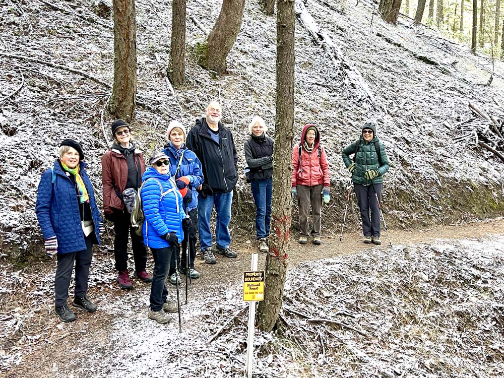 Nine of our Moderate Hikers spent a wonderful morning together hiking up and around in our watershed on the Red Queen Trail on a crisp sunny day. We covered 4 miles RT with an elevation gain of 886’.