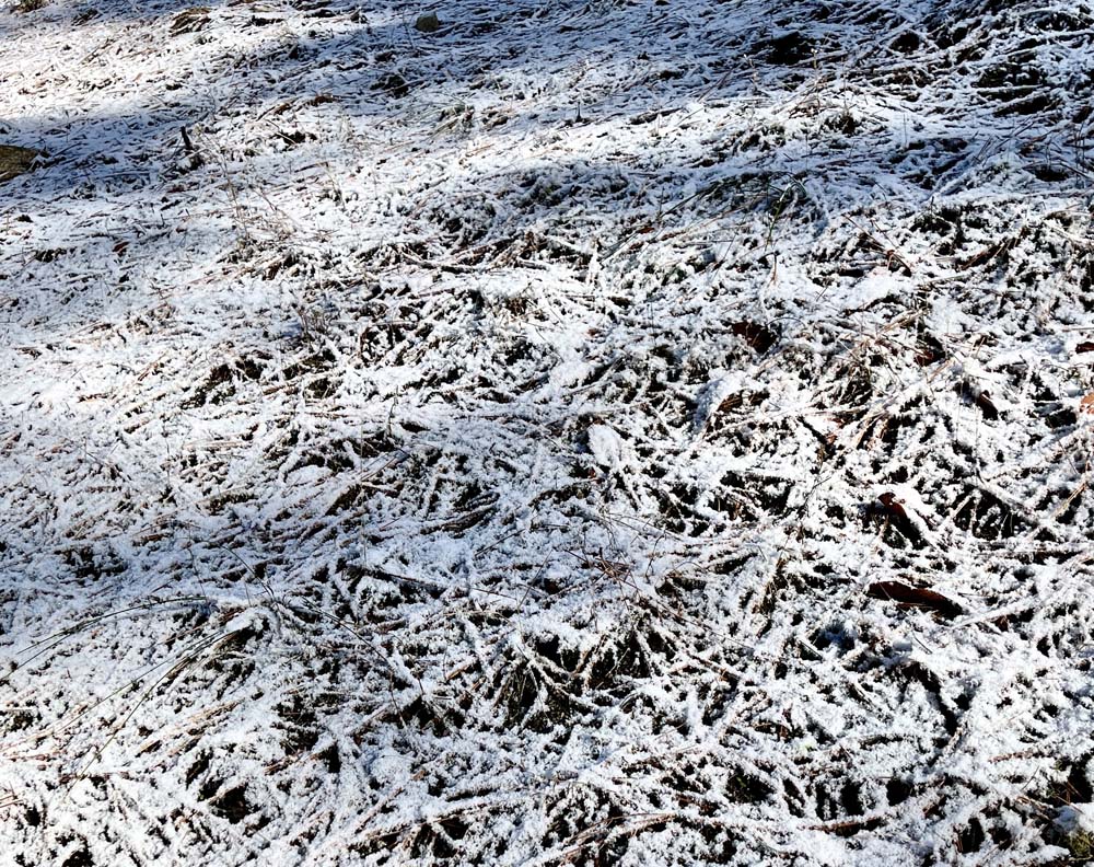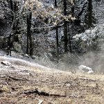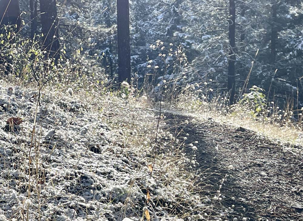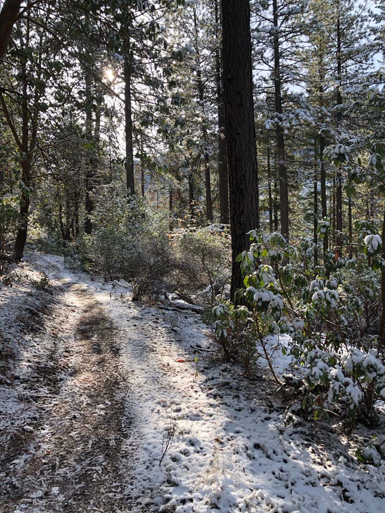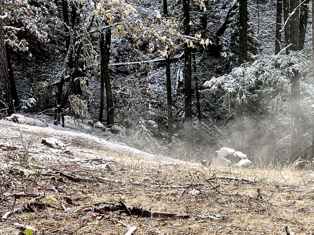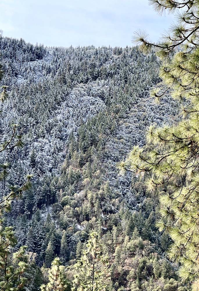 The manzanita, madrone, oak, and various evergreen trees were beautifully dusted with snow. Frozen little branches made the hillsides look like blankets of white lace.
