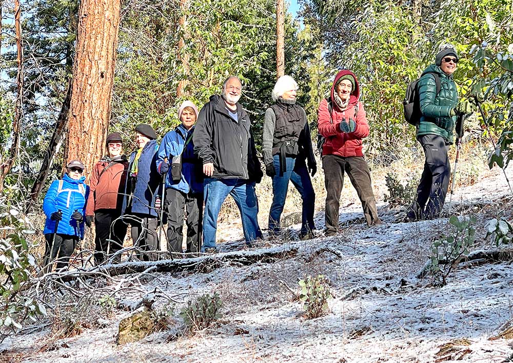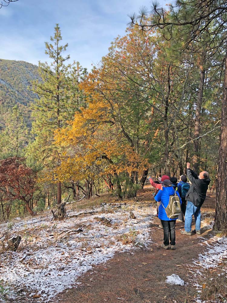Our group is very observant and appreciates highlighting special phenomena in nature. Kris pointed out an example of sublimation as the snow coverage disappeared during our hike [Definition of “sublimate:” To pass directly from the solid to the vapor state and condense back to the solid state]. Mabrie drew our attention to the ‘steam’ rising from the snowy ground as the sun hit the cold earth, creating an ethereal presence before the snow dusted mountains rising on the distant horizon. Winter has arrived in Ashland.