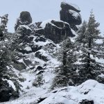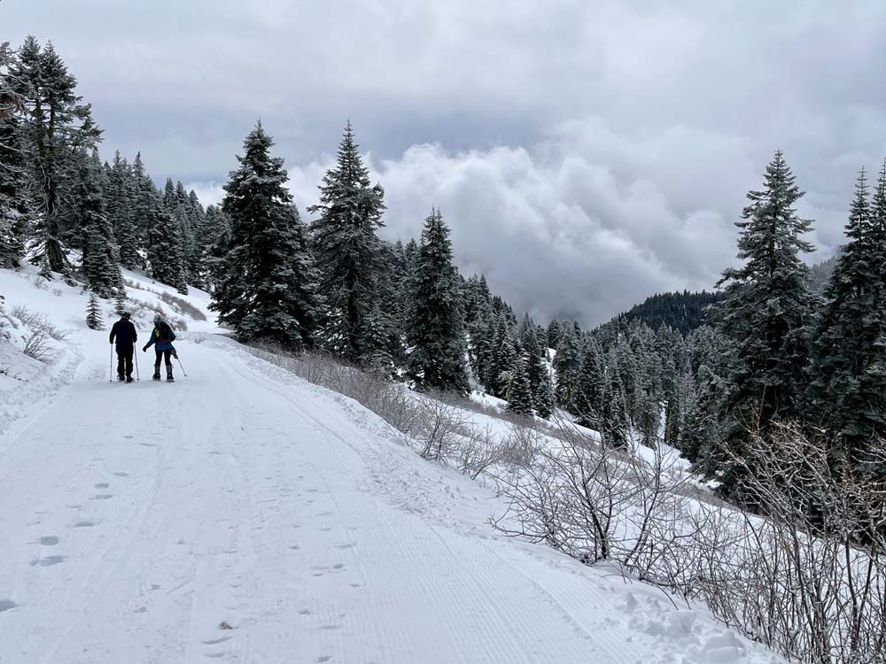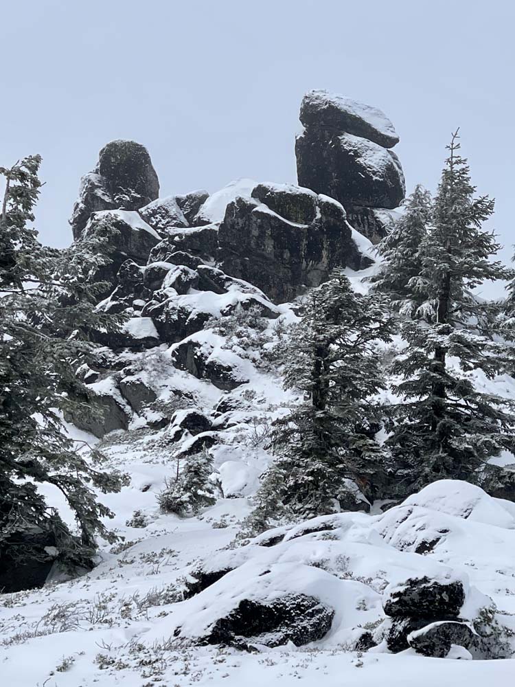 Nine of us repeated the 4-mile round trip on Mt. Ashland’s FS#20 up to Rabbit Ears. Repeating this trek in a row over the past three weeks was unusual for us. Doing so revealed how fresh it feels under different weather conditions. This 3rd time revealed the beauty of the clouds and fog layers moving amongst the mountain ranges. The usual expansive views of Mt. Shasta were replaced by fascinating shapes made by shifting clouds, ribbons of blue between their layers, and tree branches adorned by ‘lace’ formed by thin icy snow.