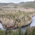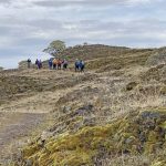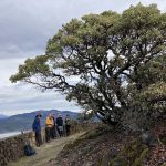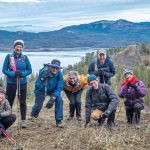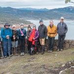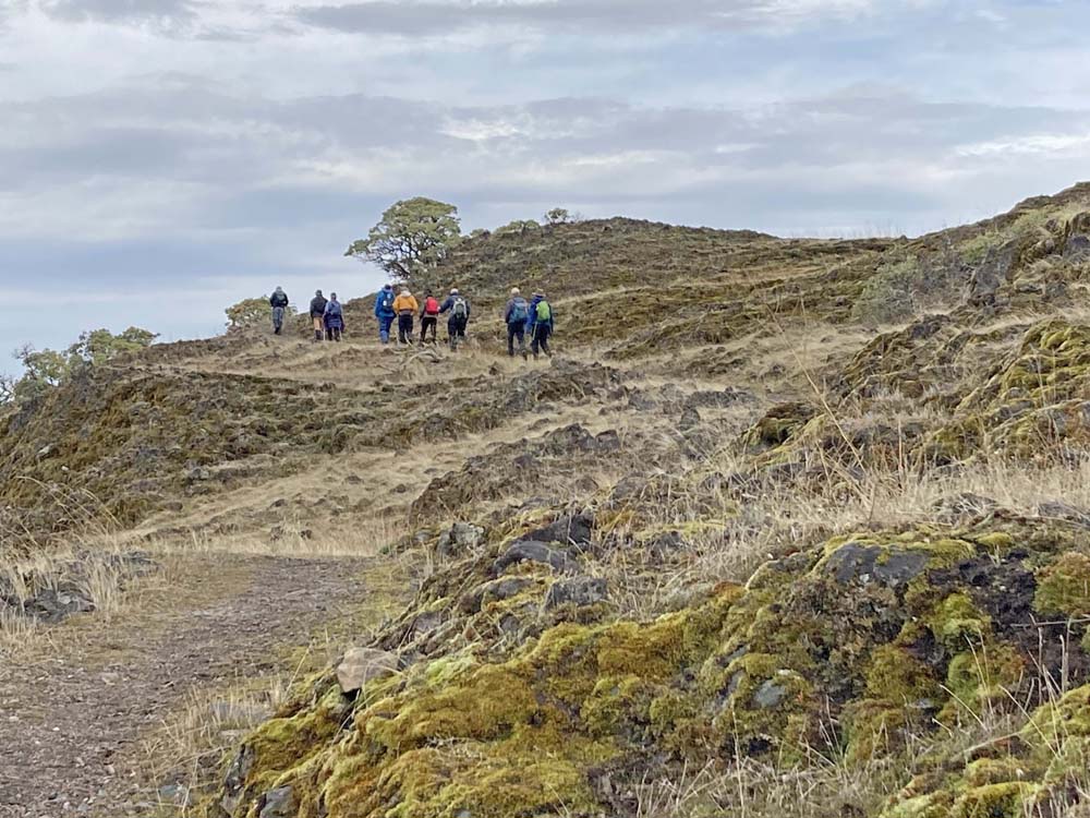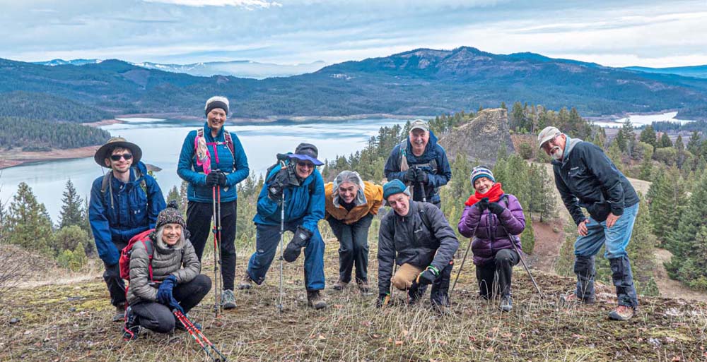 After stopping by the viewpoint wall for the group shot, we continued up through the forest and out to the cliff with views of the burrow pit to the east. We had lunch there and took another group shot with Flounce Rock in the background.