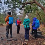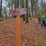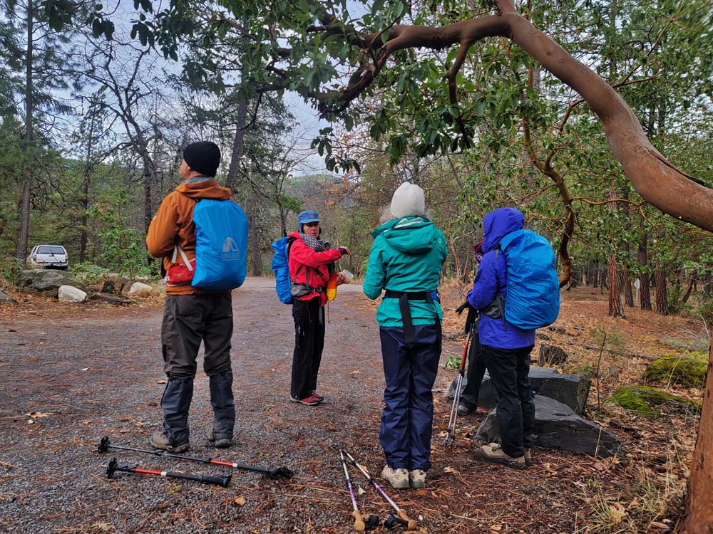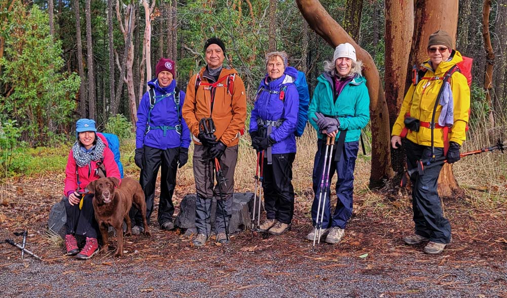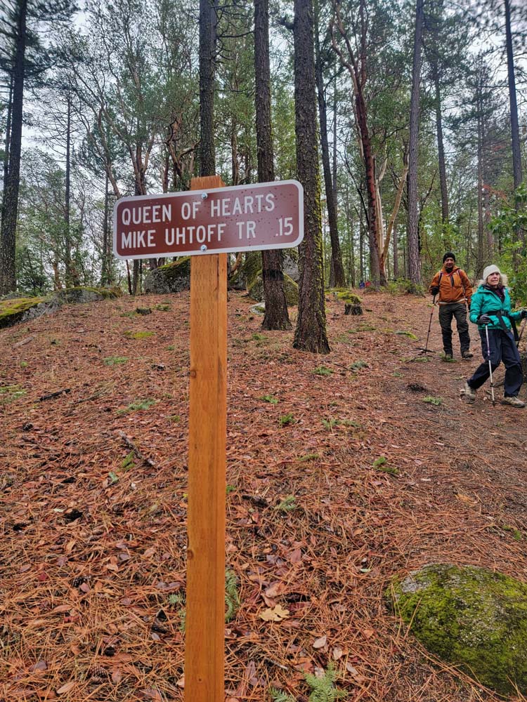 We continued up the Mike Uthoff trail then down to White Rabbit Upper Trailhead for lunch. Leslie decided to get Heath’s phone number off his tag on his collar in case we needed to contact his people. We had him join us in the group picture.