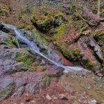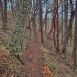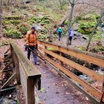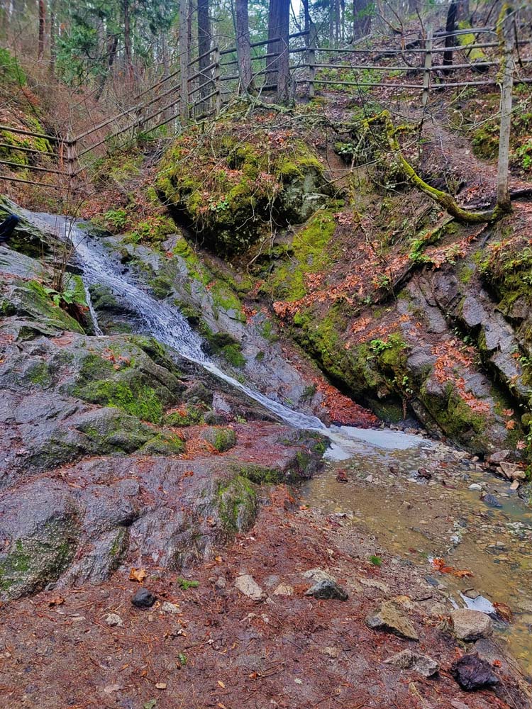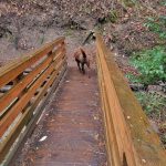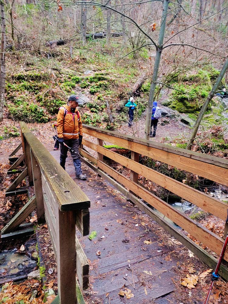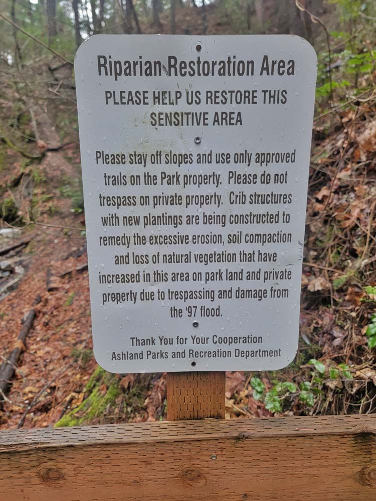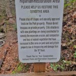 As we started out, we were out of the rain and the wind wasn’t blowing too hard. After about a half of a mile we came to a nice little waterfall. After crossing the bridge, we saw a sign saying they are trying to restore the area with new plantings. There has been excessive erosion and soil compaction from trespassing. There is also damage from the 1997 flood.