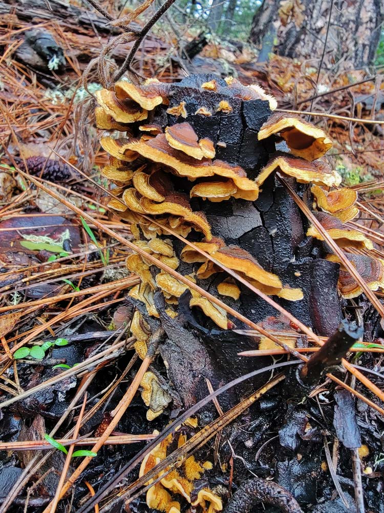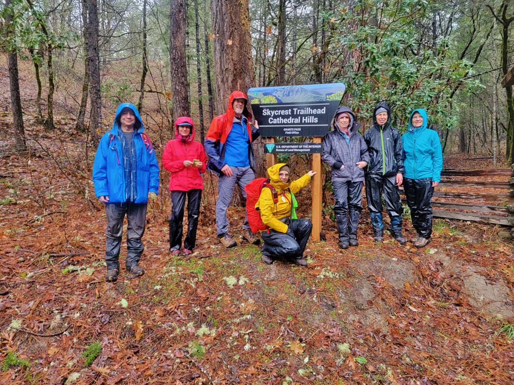 We continued around the Outback Loop and connected to the Ponderosa Pine Loop. These trails are shared with mountain bikes and we could see how some of the trails were banked up to make for fun turns on bikes. We connected back to the Outback Loop to the Timberline Trail back to the cars. The group photo was taken after the hike at the Skycrest Trail sign.